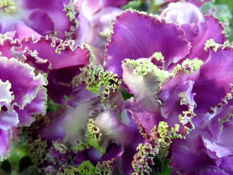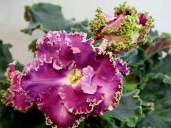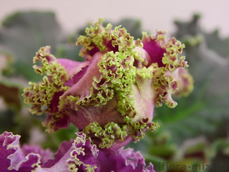 Крупные полумахровые ярко винномалиновые цветы с сильно гофрированными краями и белым глазком в центрена высоких крепких цветоносах. Слегка волнистая темная листва.При прохладном содержании белый глазок более выражен и рюша приобретает зеленый цвет. Описание автора