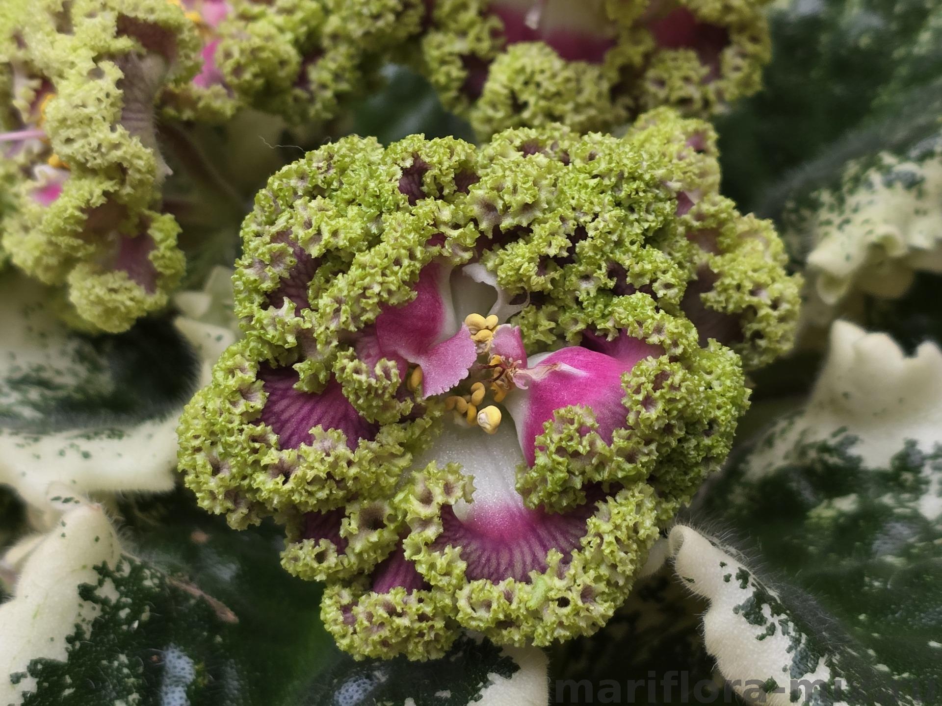 Край лепестков оборчатый, с густым зелёным рюшем, растягивающимся в волан по мере взросления цветка. Цветение обильное и длительное.