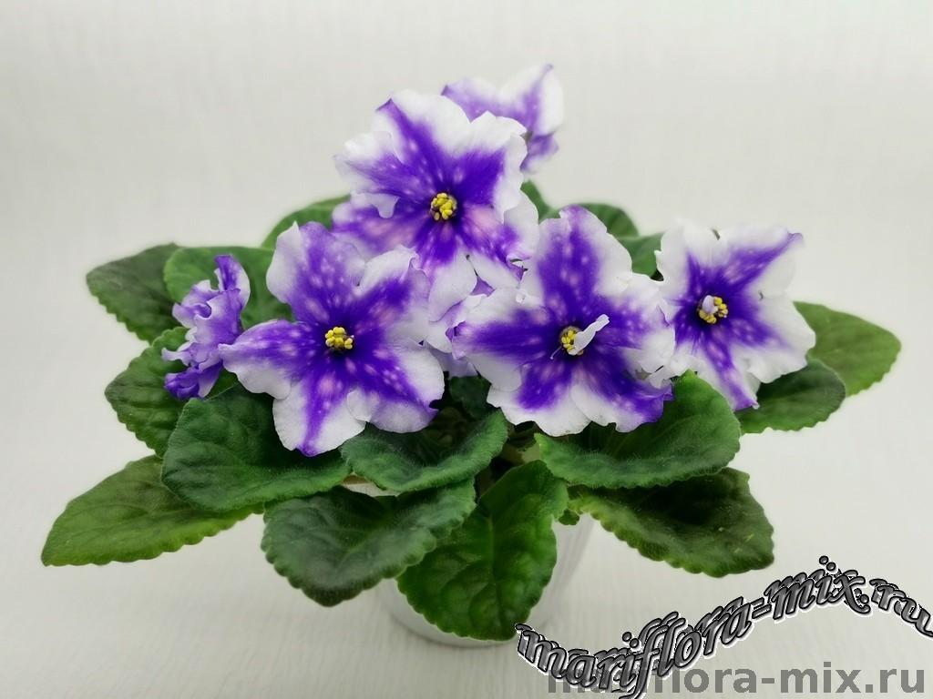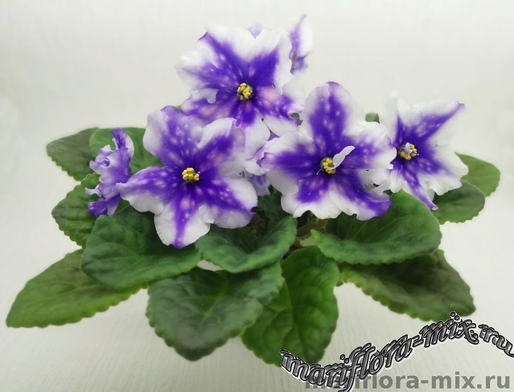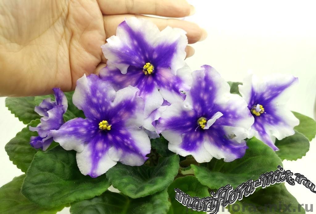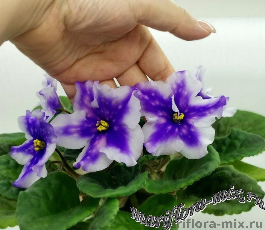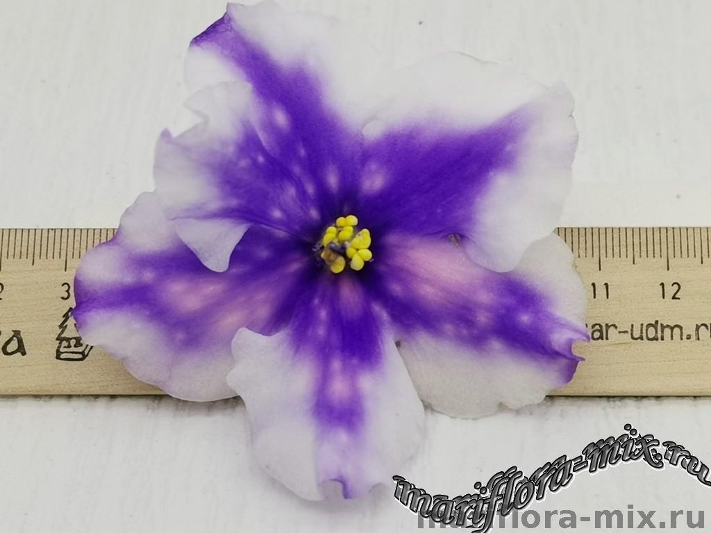 Очень крупные (8 см) лавандовые звёзды, густо усыпанные розовым горохом фентези, широкая белая кайма по краю лепестков. Количество белого варьируется в зависимости от температуры, в прохладе его больше. Фентези очень вариативной формы, по мере роспуска и взросления многие горошинки растекаются в «островки». Обильное длительное цветение.