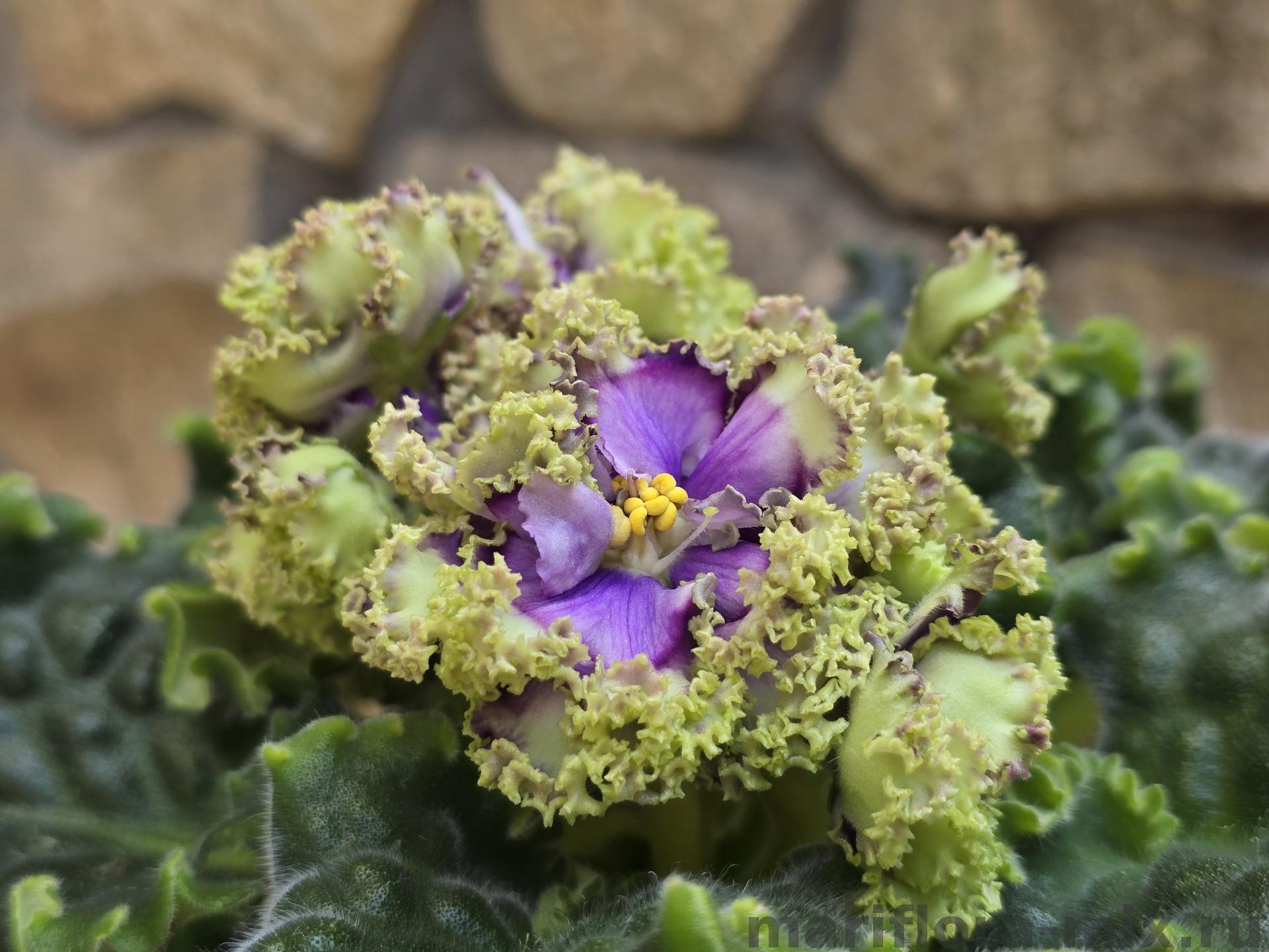 Полумахровые сиреневые звёзды с плотным ярко-зелёным бахромчатым краем лепестков. Обратная сторона лепестков зеленая. Цветы плотной фактуры распускаются медленно, цветёт бесконечно.
