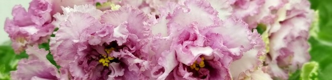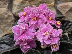 Розовые полумахровые звёзды, с фактурным белым кантом по краю лепестков. Россыпь двойного фентази по лепесткам в виде фиолетовых штришков и белых горошков