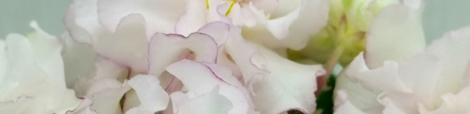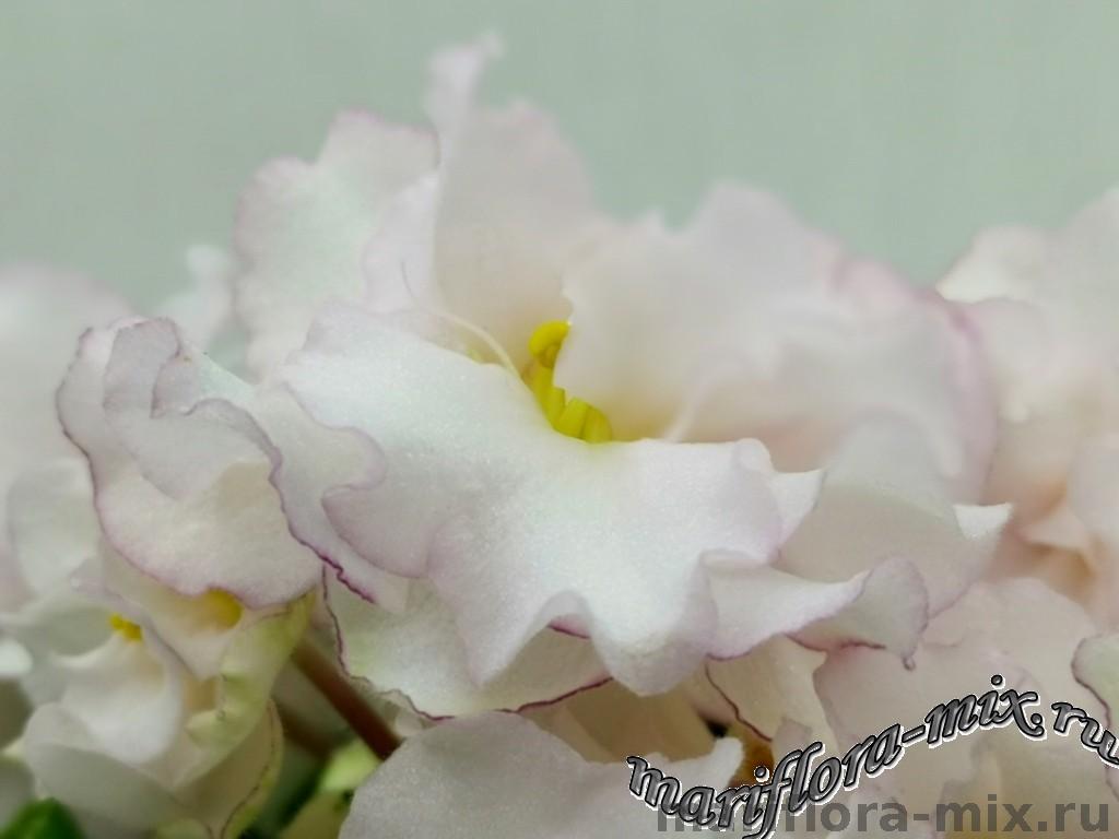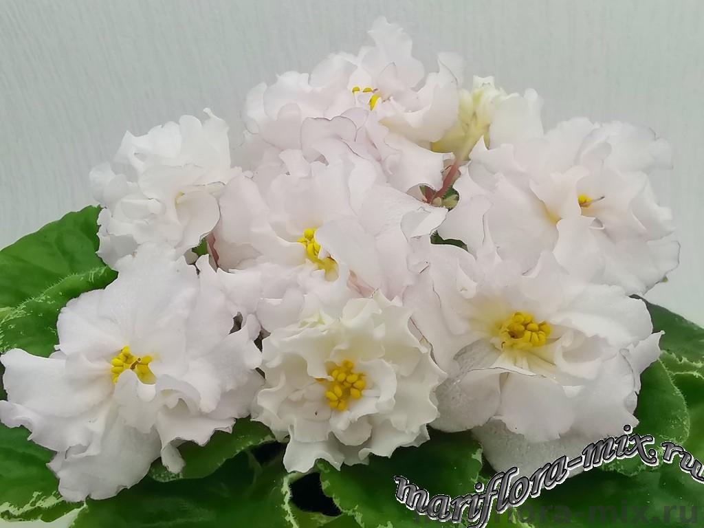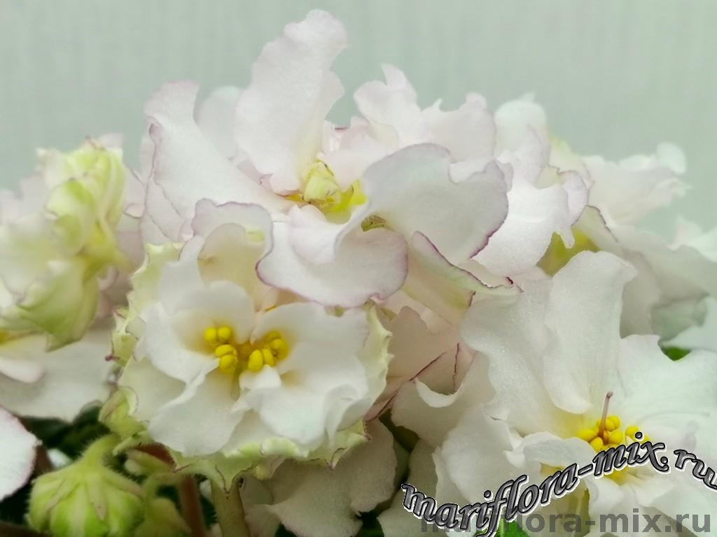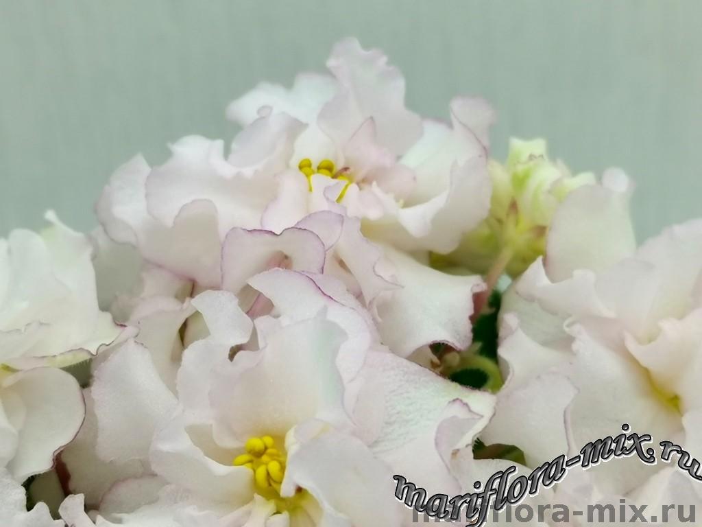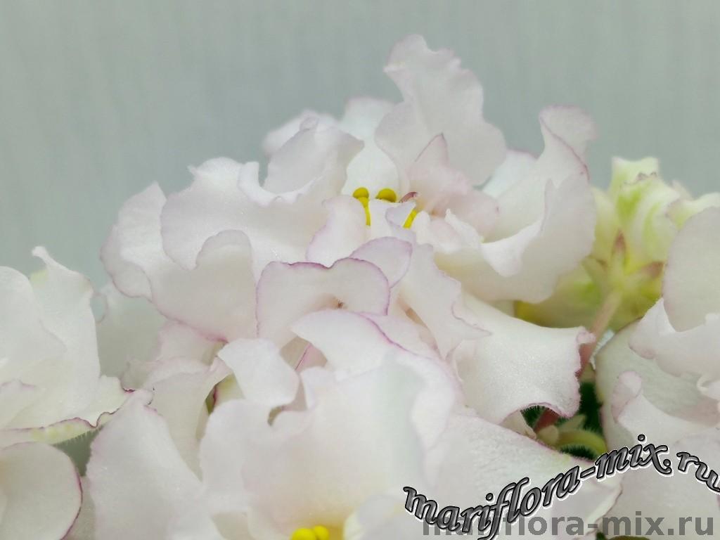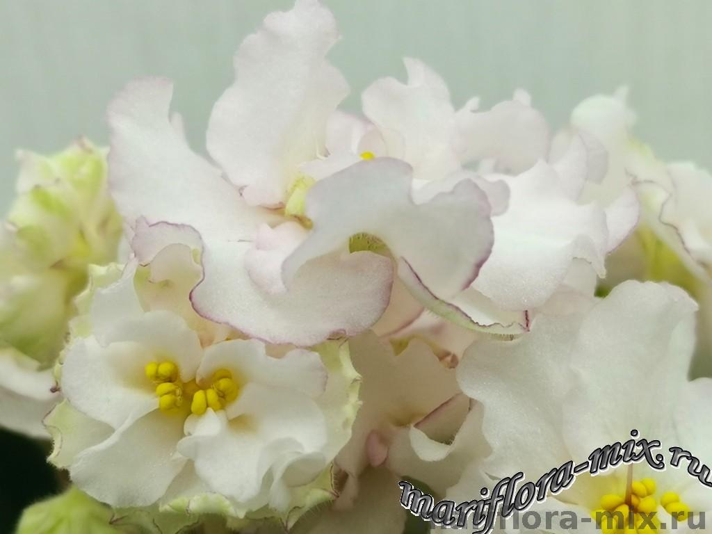 Махровые звёзды кремово-белого цвета, с карандашной каймой малинового цвета по краю лепестков. В центре цветов присутствует сгущение слегка жёлтого цвета. Обильное цветение, короткий цветонос. Пестролистная, с белым “Tommie Lou” листва. Стандарт.