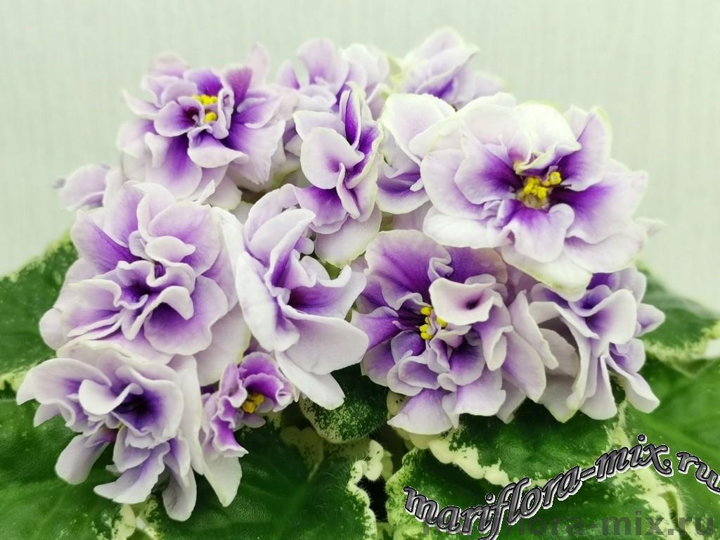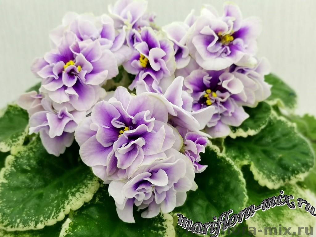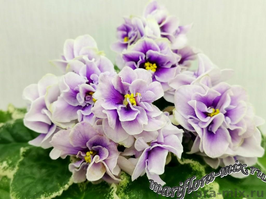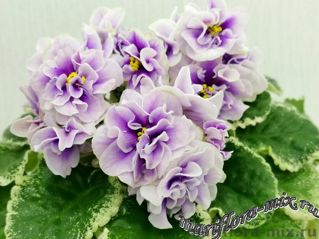 Махровые цветы звёзды белого цвета, с глазком сливового цвета. Глазок растекается по лепесткам от темного в центре до более светлого, создавая эффект градиента на лепестках. Цветы плотной фактуры, словно кремовые розы на торте. Цветение обильное, длительное, короткие цветоносы. Обратная сторона лепестков имеет светло-зелёную пропитку, за счёт чего цветы очень долго остаются свежими. Светло-зелёная стёганная листва с белой “Tommie Lou” пестролистностью. Стандарт.