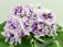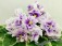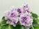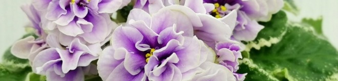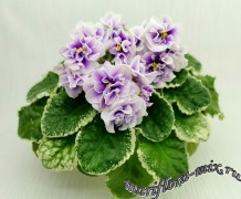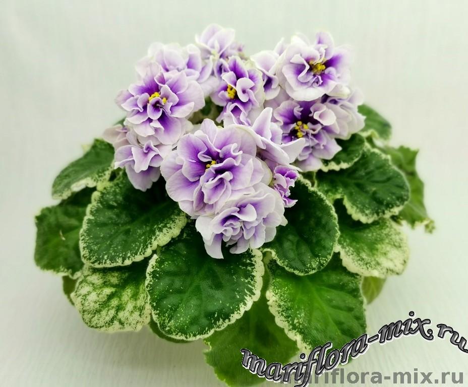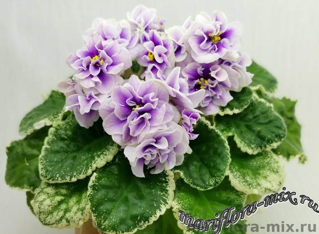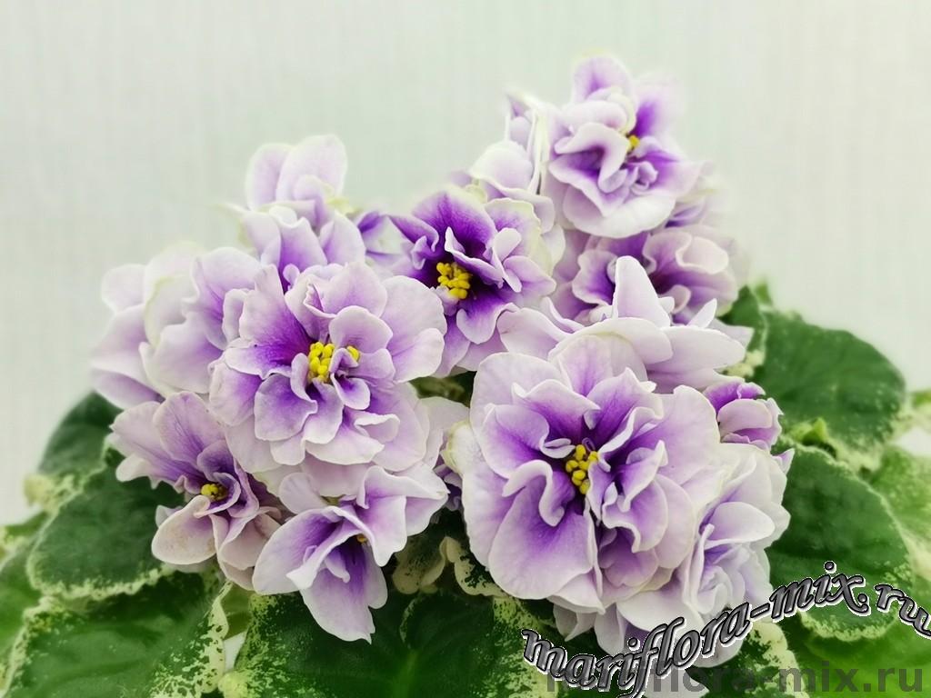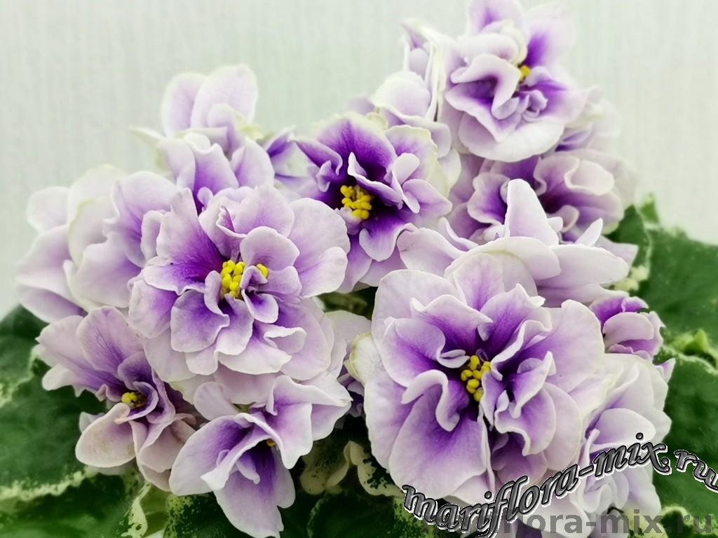 Махровые цветы звёзды белого цвета, с глазком сливового цвета. Глазок растекается по лепесткам от темного в центре до более светлого, создавая эффект градиента на лепестках. Цветы плотной фактуры, словно кремовые розы на торте. Цветение обильное, длительное, короткие цветоносы. Обратная сторона лепестков имеет светло-зелёную пропитку, за счёт чего цветы очень долго остаются свежими. Светло-зелёная стёганная листва с белой “Tommie Lou” пестролистностью. Стандарт.