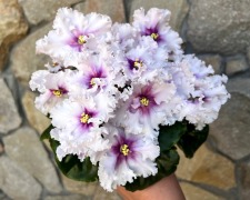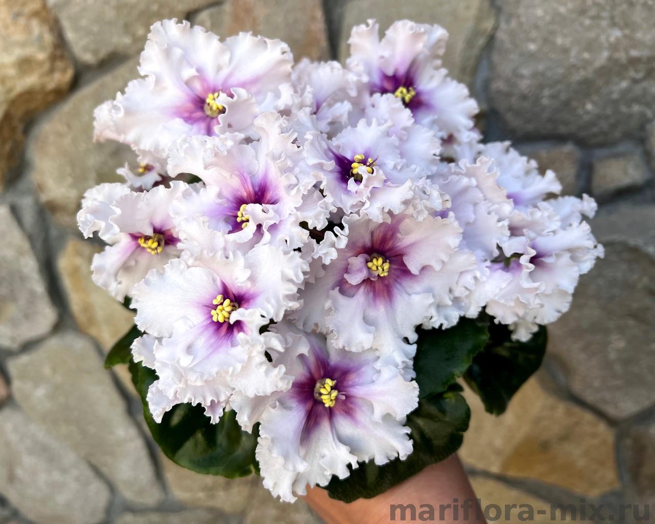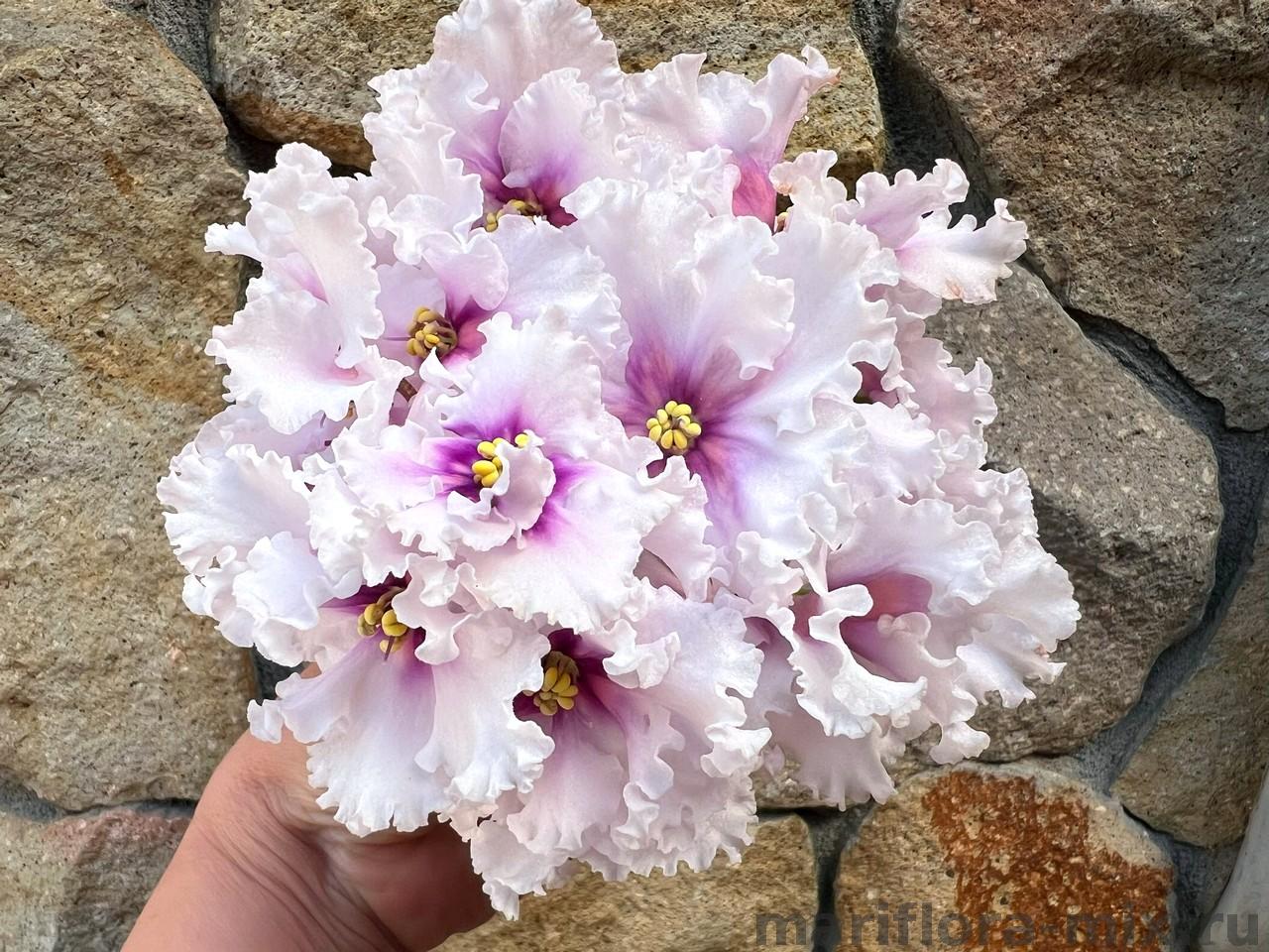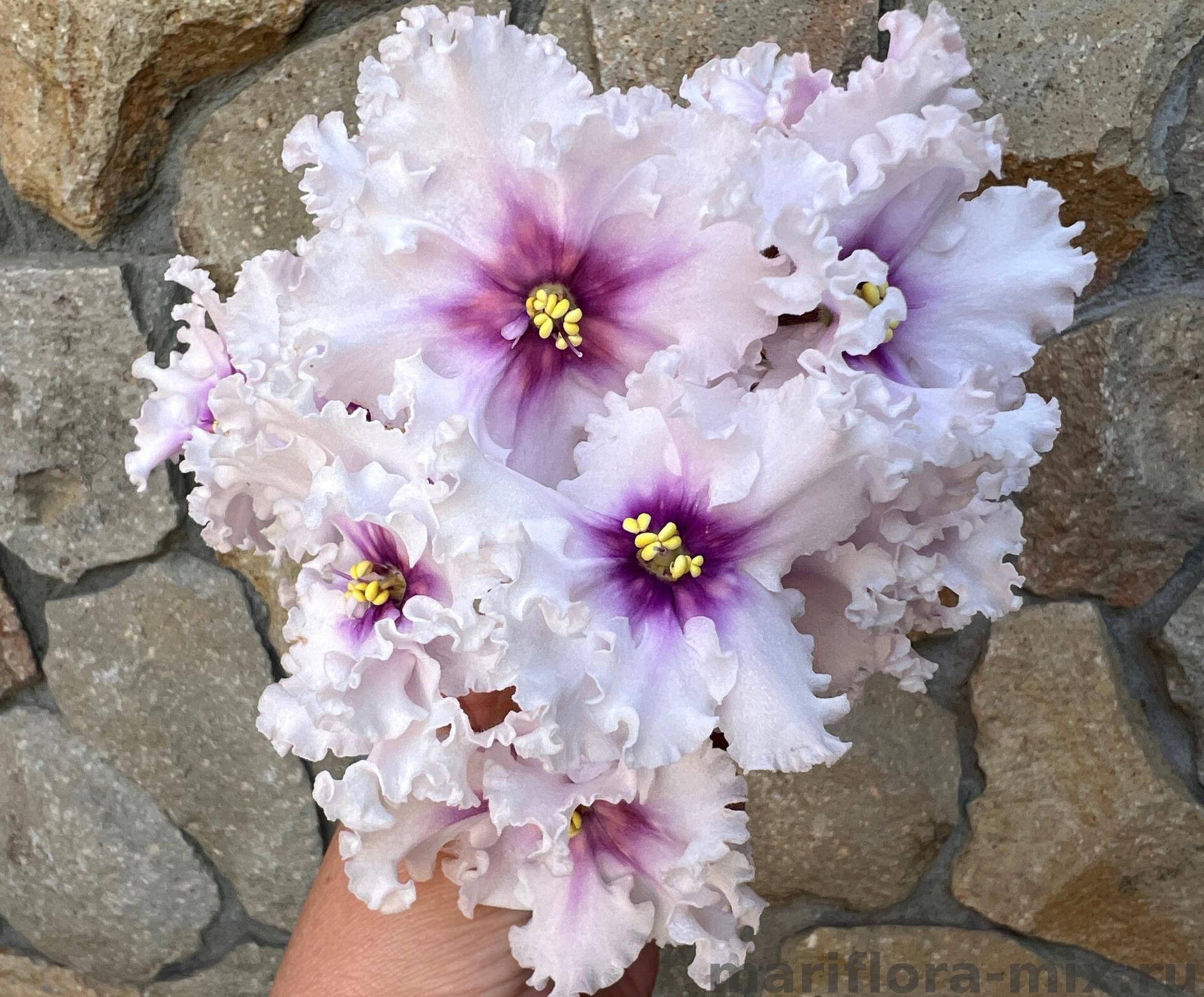 Крупные белые звёзды с розовым глазком, усыпанным обильным фентази в виде более светлого розового гороха. Фентази по мере роспуска меняется от светло-розового до лососевого цвета. Форма горошин вариативна, у зрелых цветов фентази растекается, создавая эффект струящегося свечения внутри глазка. Светло-зеленая гёрл листва.