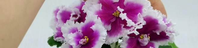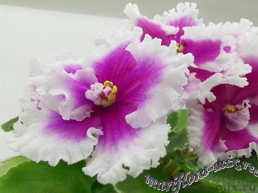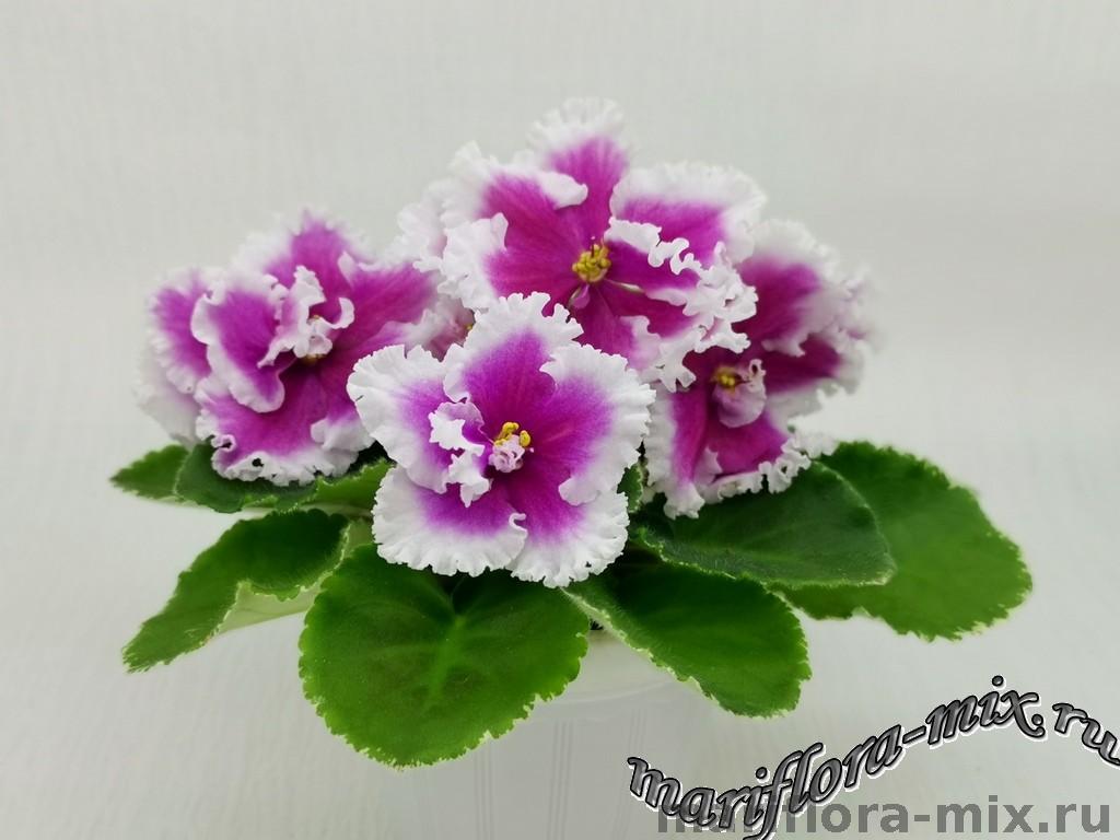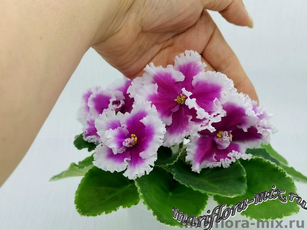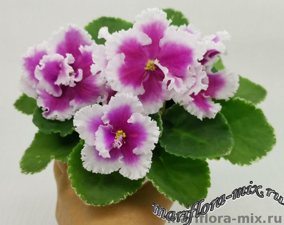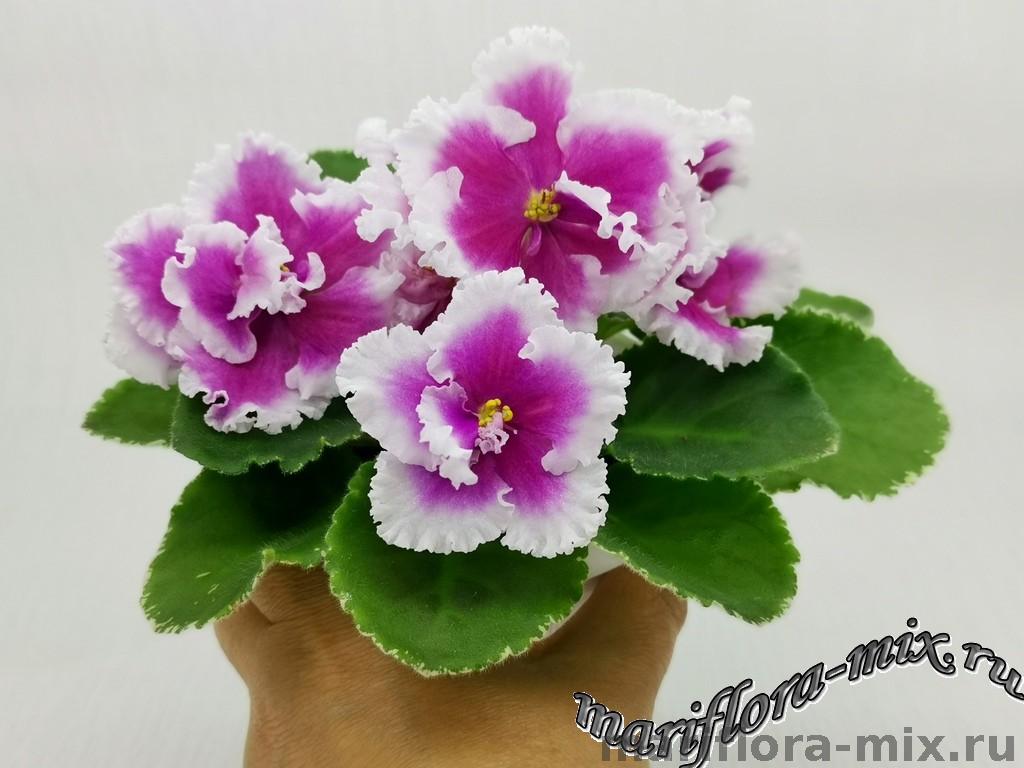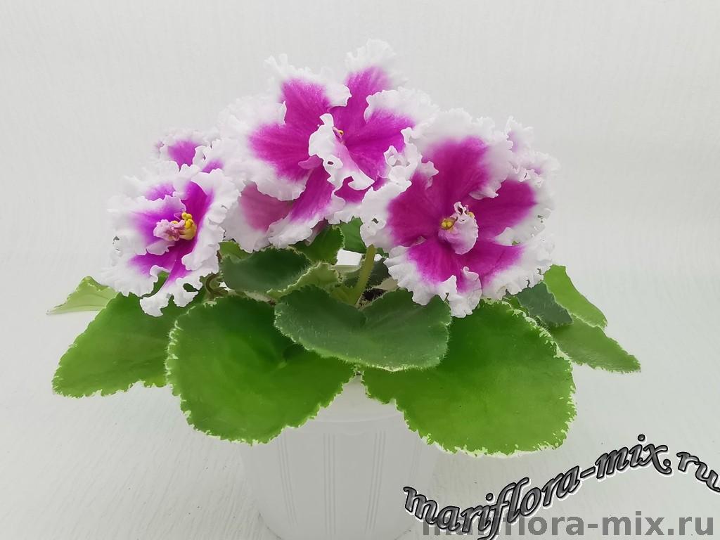 Очень крупные, ярко-розовые цветы звёзды. Широкая белая кайма, образующая волан по краю лепестков. Светло-зелёная листва с белой “Tommie Lou” пестролистностью. Стандарт