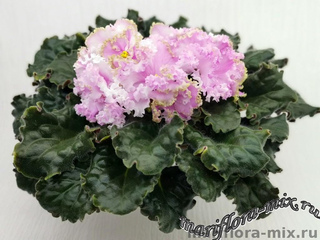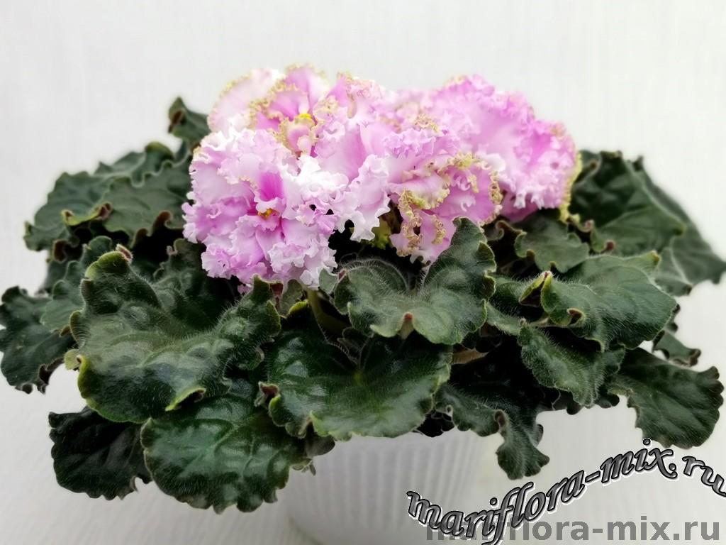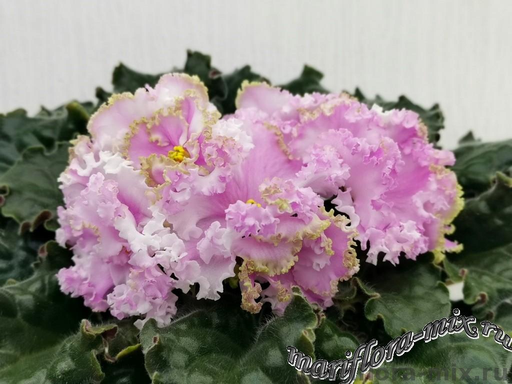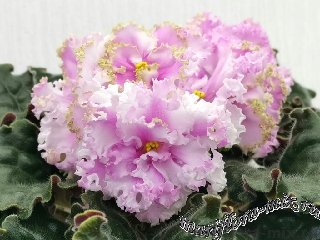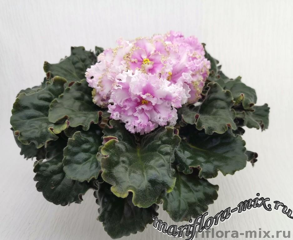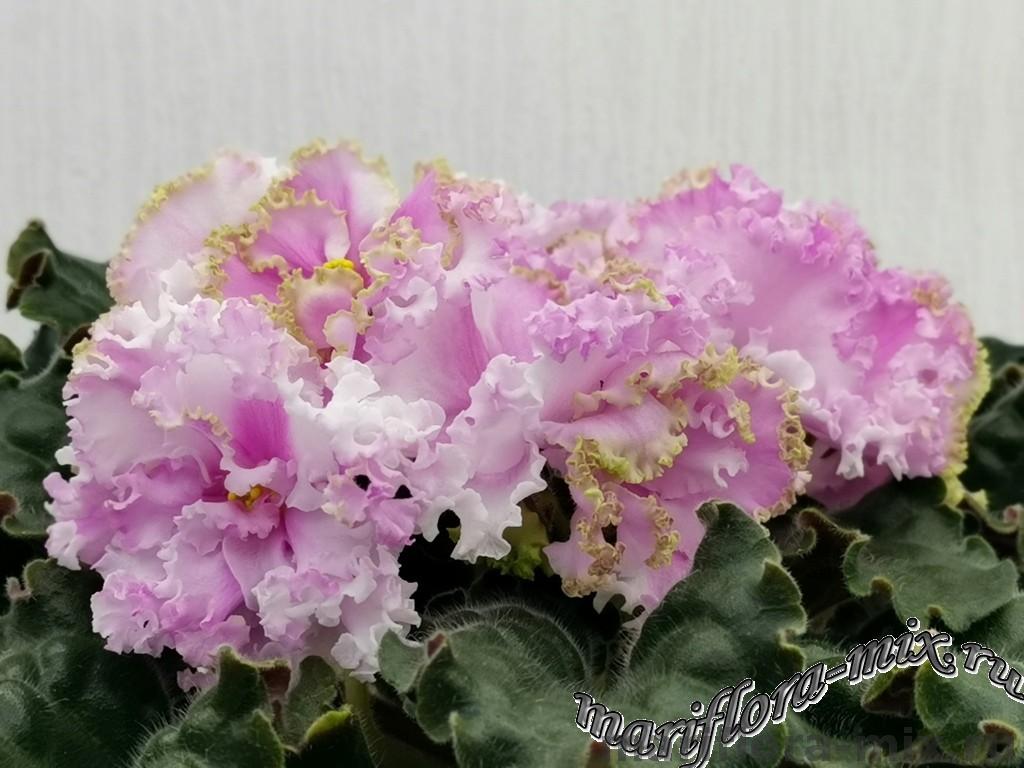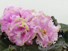 Очень крупные (8 см) полумахровые, белые с розовым цветы, с густым зелёным рюшем по краю лепестков в начале цветения. По мере роспуска цветка, рюш растягивается, образуя волан по краю лепестка. Цветы к концу роспуска становятся очень эффектными. Цветение длительное. Тёмно-зелёная стёганная листва. Стандарт