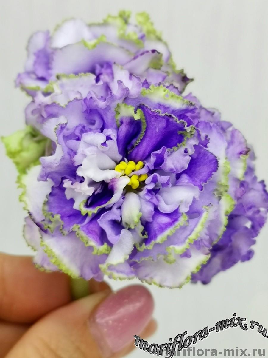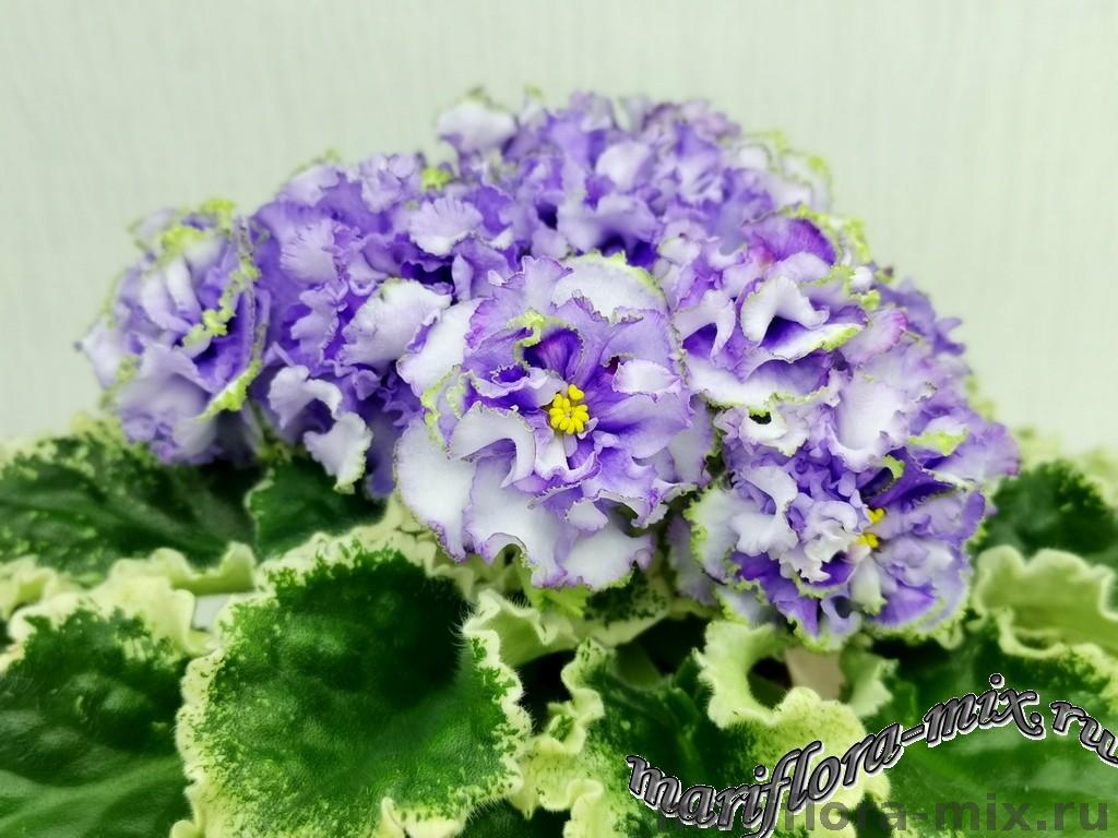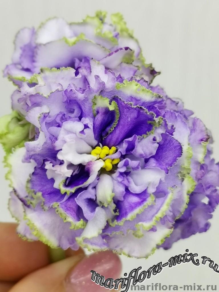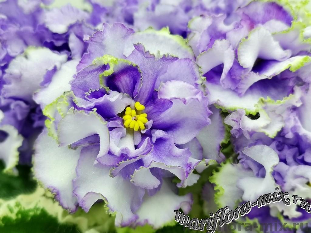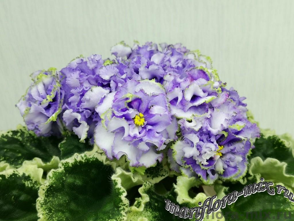 Белые с голубым густомахровые цветы звёзды с зелёным рюшем по краю лепестка. Короткие цветоносы, обильное цветение. В центре цветка сгущение голубого цвета.