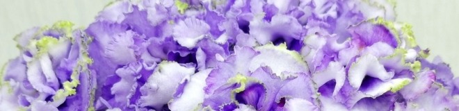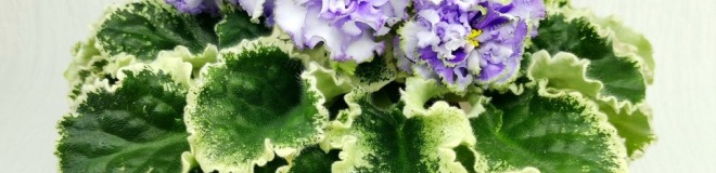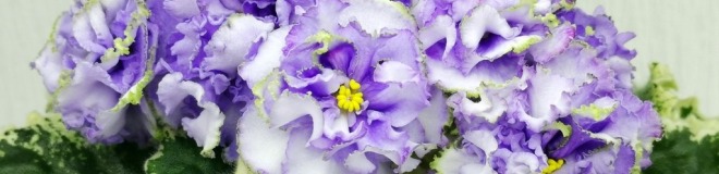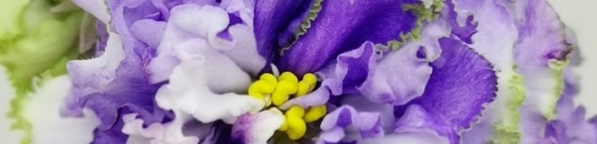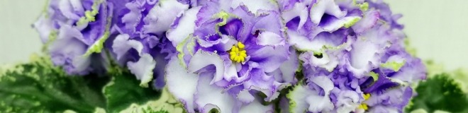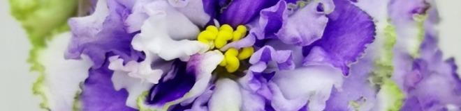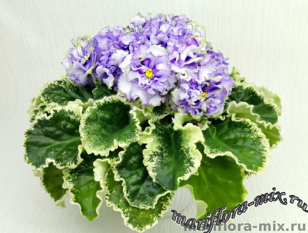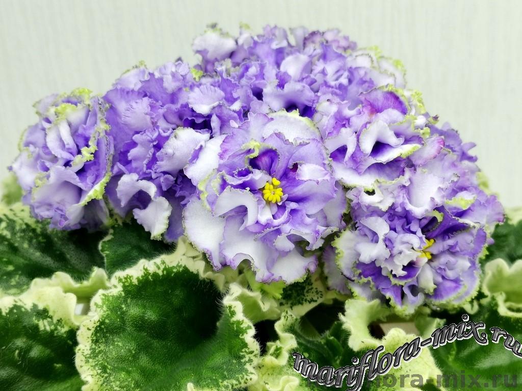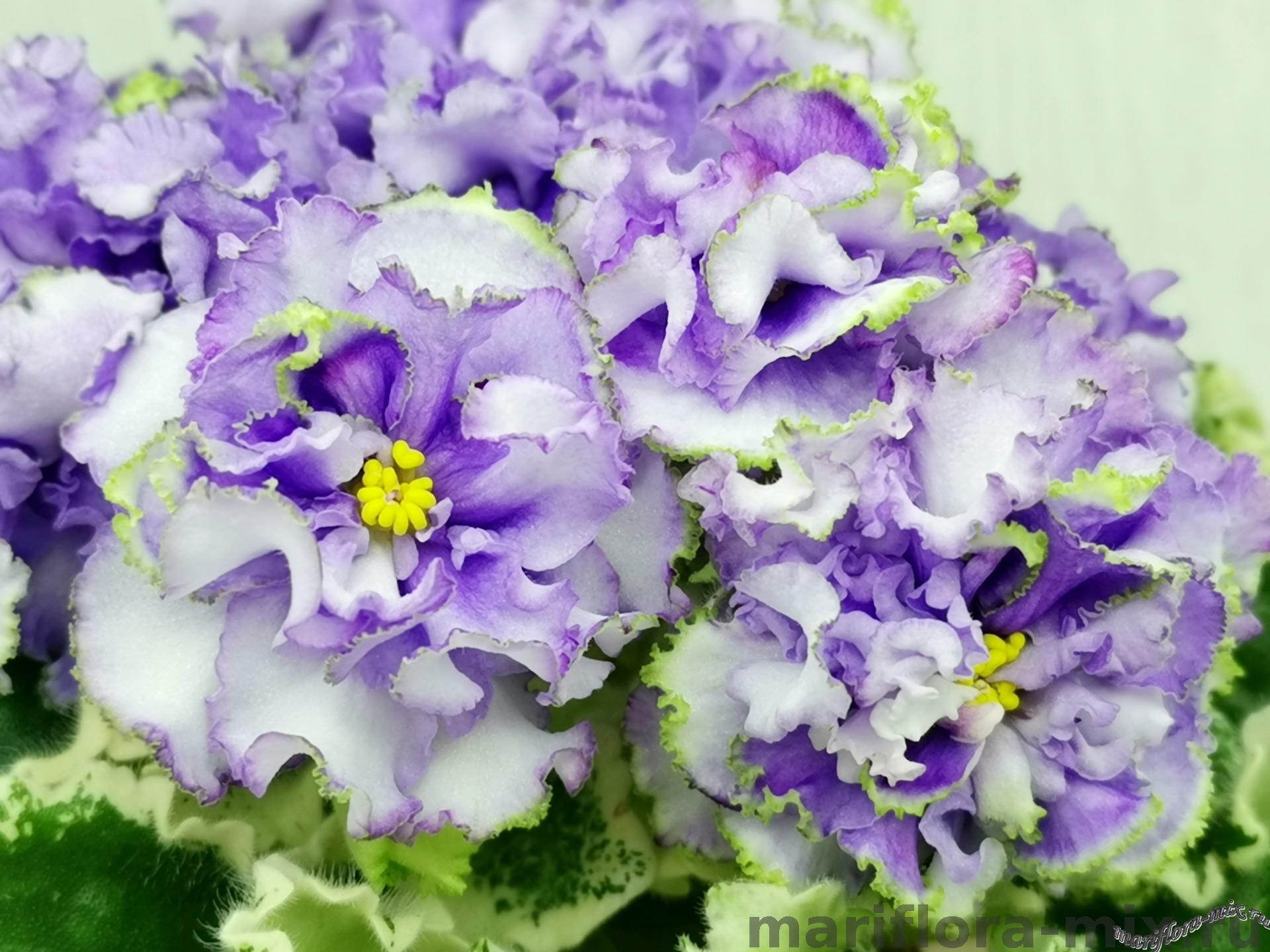 Белые с голубым густомахровые цветы звёзды с зелёным рюшем по краю лепестка. Короткие цветоносы, обильное цветение. В центре цветка сгущение голубого цвета.