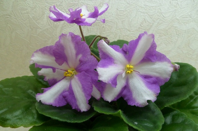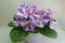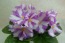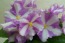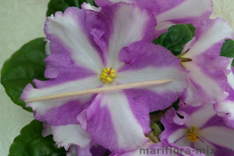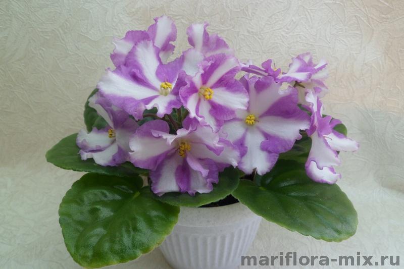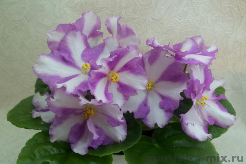 Огромные малиновые звезды с широкими белыми химерными полосами и слегка волнистыми краями лепестков. Ярко-зеленая листва. Может цвести непрерывно.