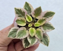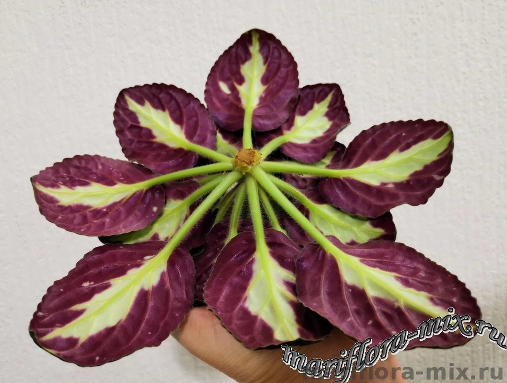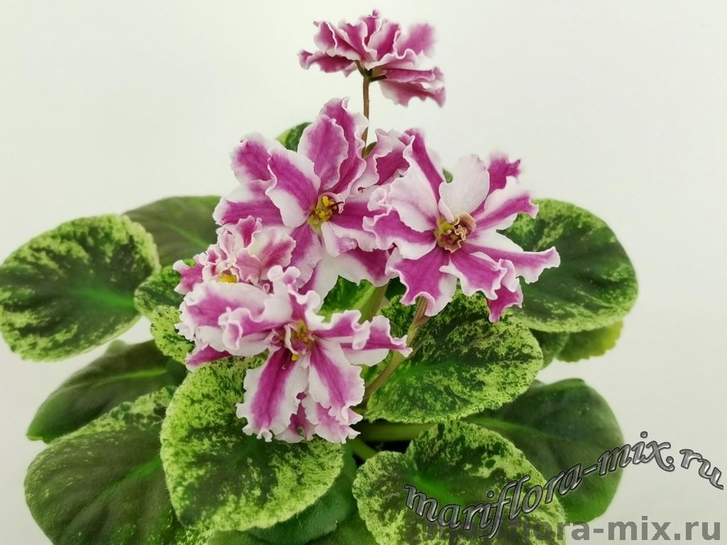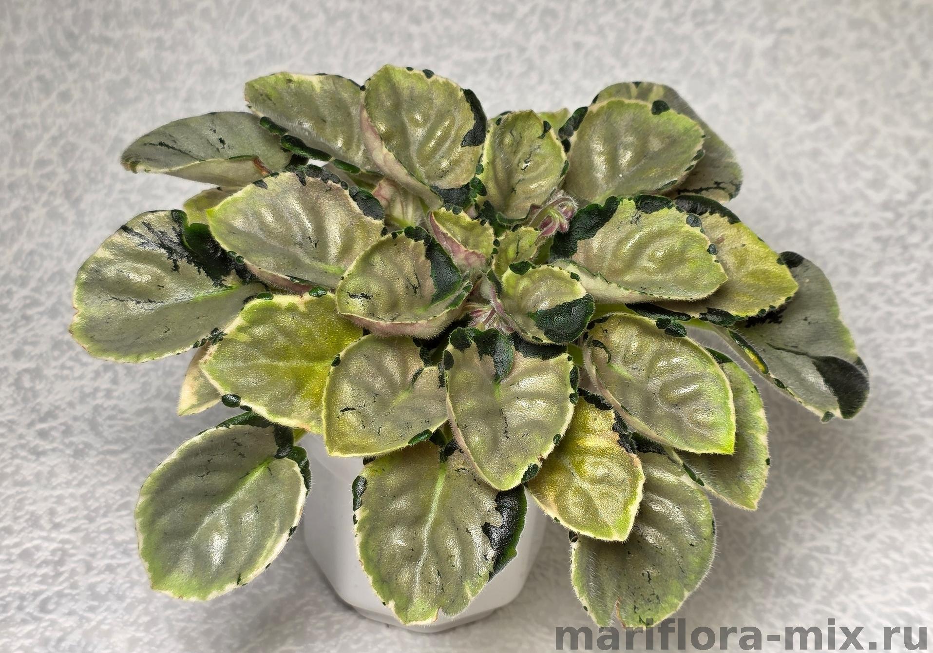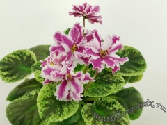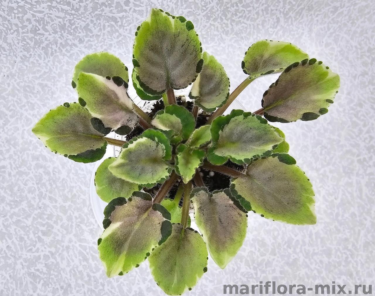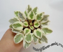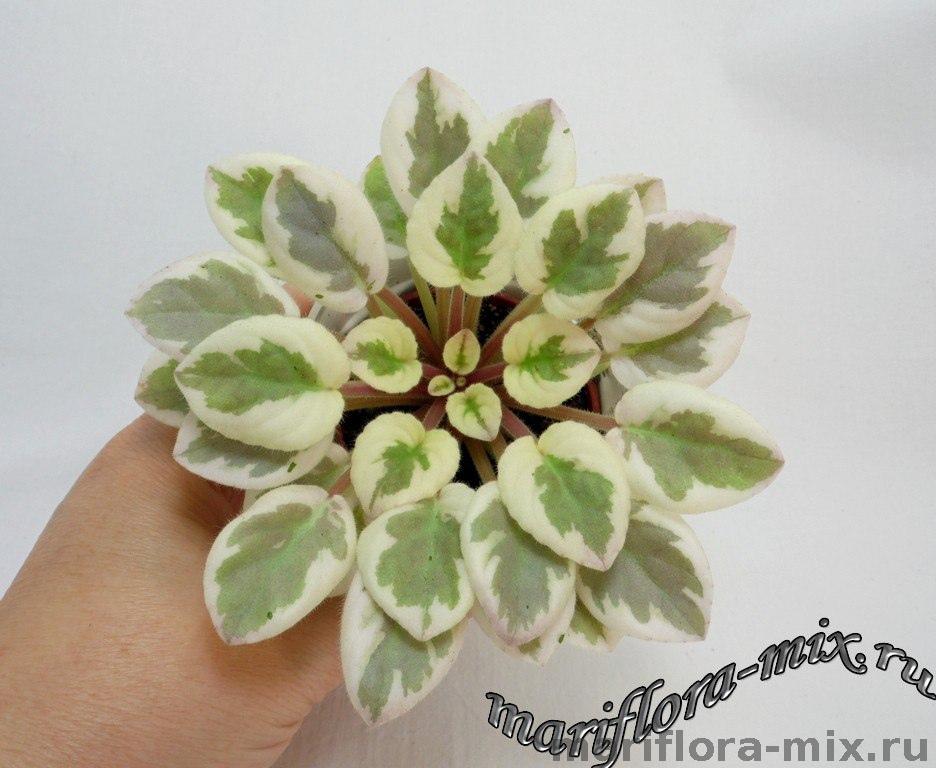 Листовая химера. Листья с широким белым краем и серо-зеленым центром. Изнанка листа малиновая и это слегка окрашивает белый цвет в розовый. В основании листовой пластины, и по белому полю, хаотично-разбросанные темно-зеленые (почти черные) пятнышки. Химера устойчива, с хорошей передачей сортовых признаков. Цветки пастельно-розовые с зеленым краем. Цветет только при хорошем освещении. Мини