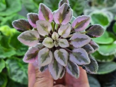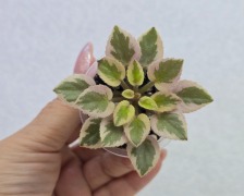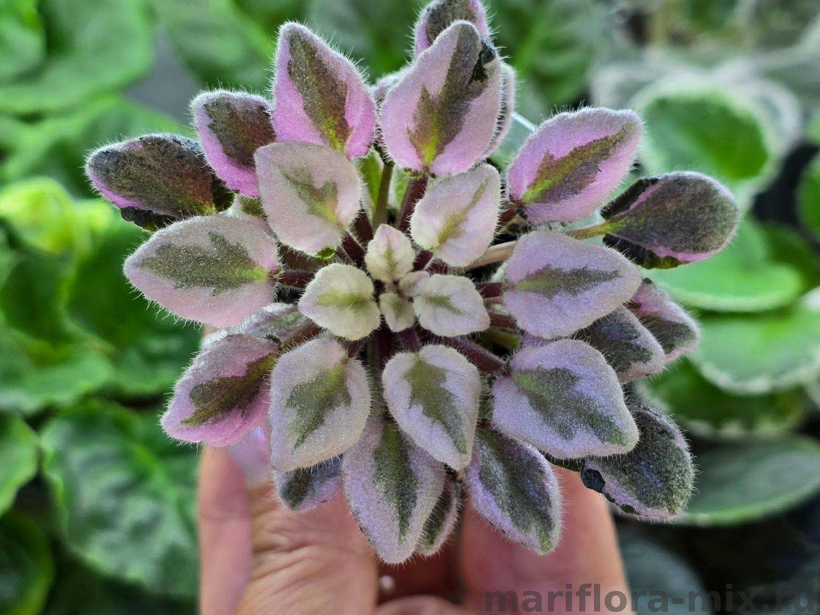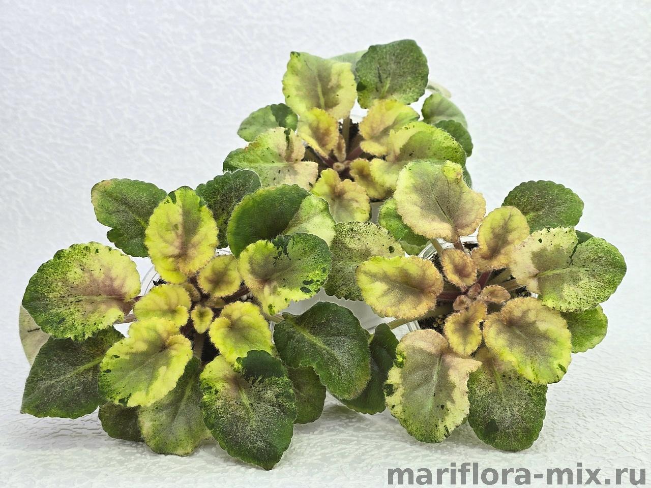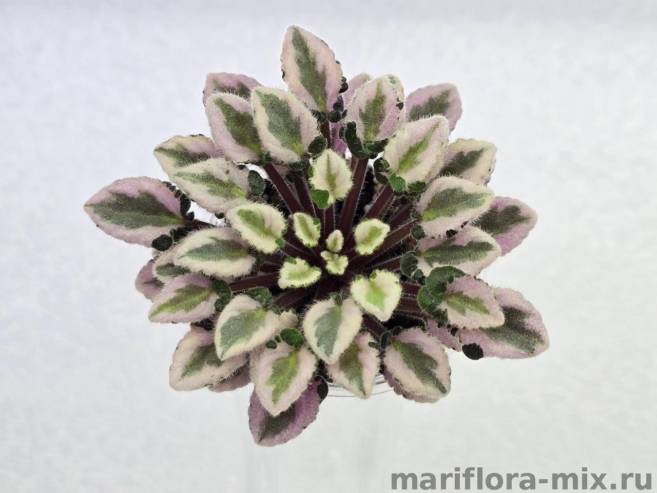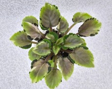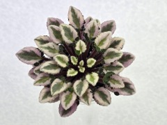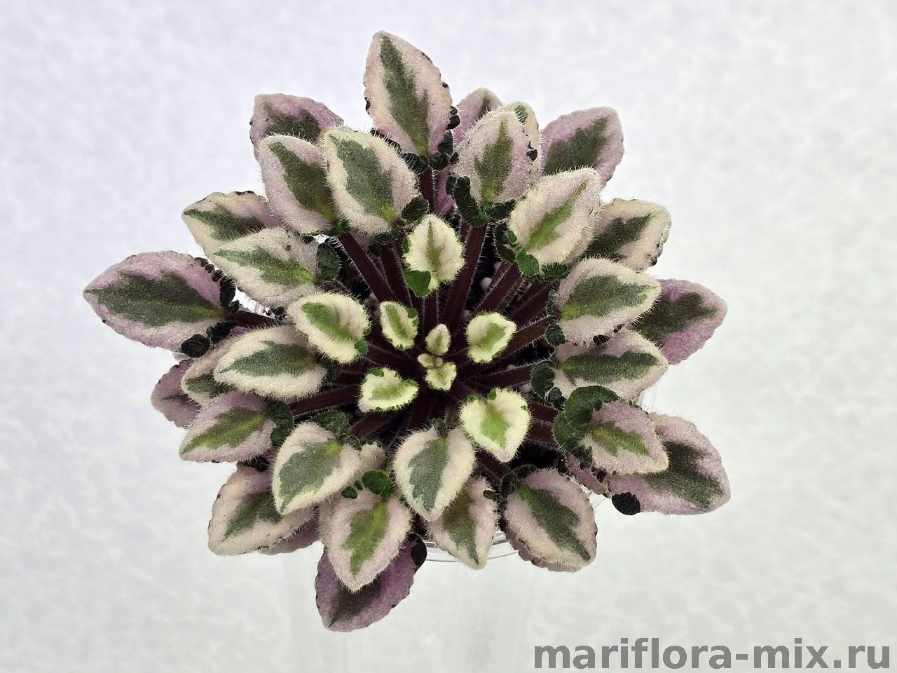 Листовая химера. Листья с широким белым краем и серо-зеленым центром. Изнанка листа малиновая и это слегка окрашивает белый цвет в розовый. В основании листовой пластины, и по белому полю, хаотично-разбросанные темно-зеленые (почти черные) пятнышки. Химера устойчива, с хорошей передачей сортовых признаков. Цветки пастельно-розовые с зеленым краем. Цветет только при хорошем освещении. Мини