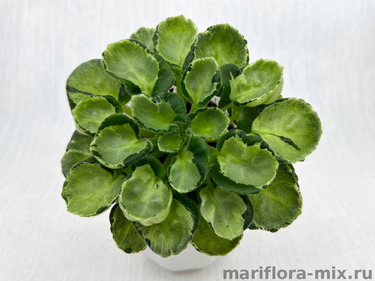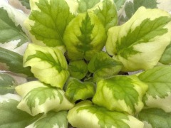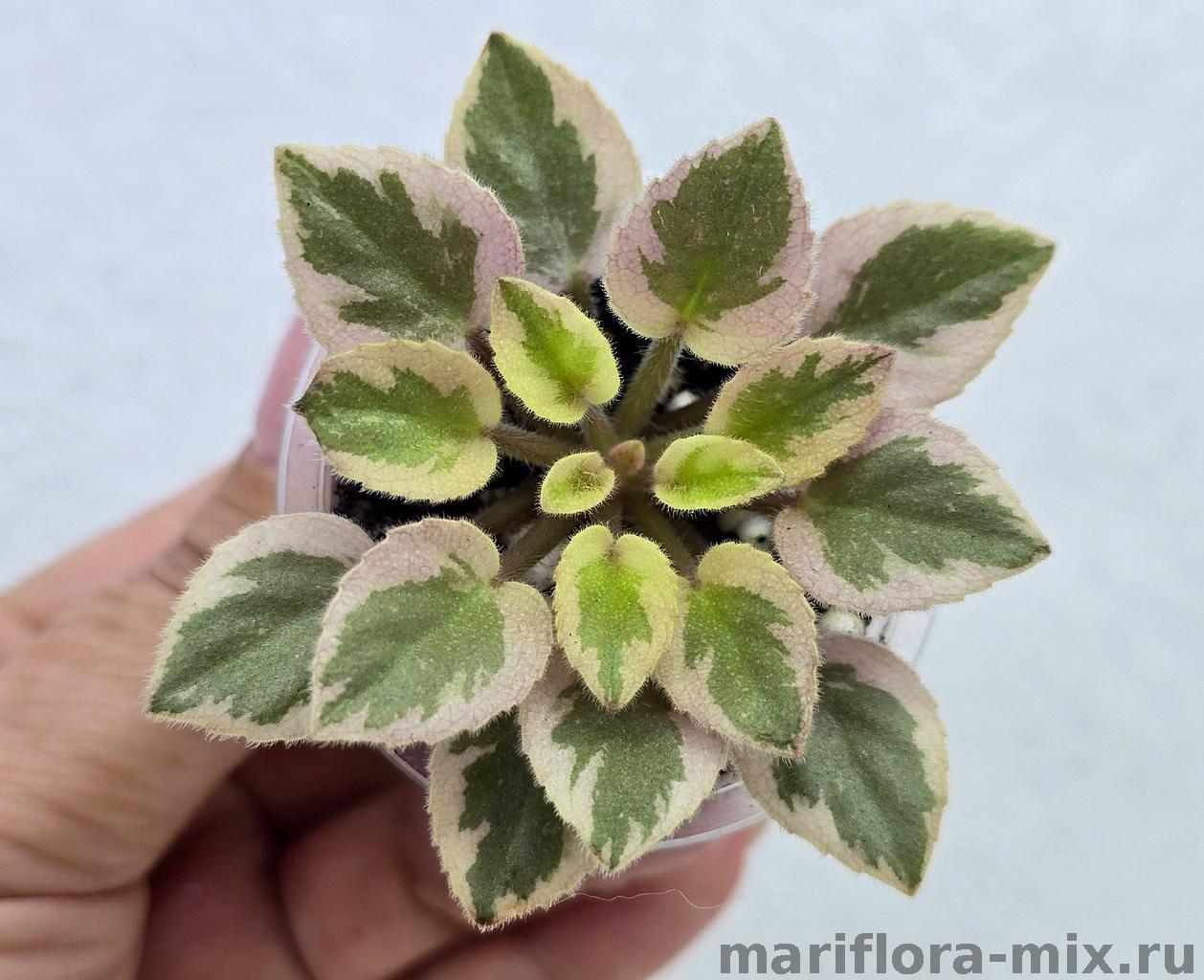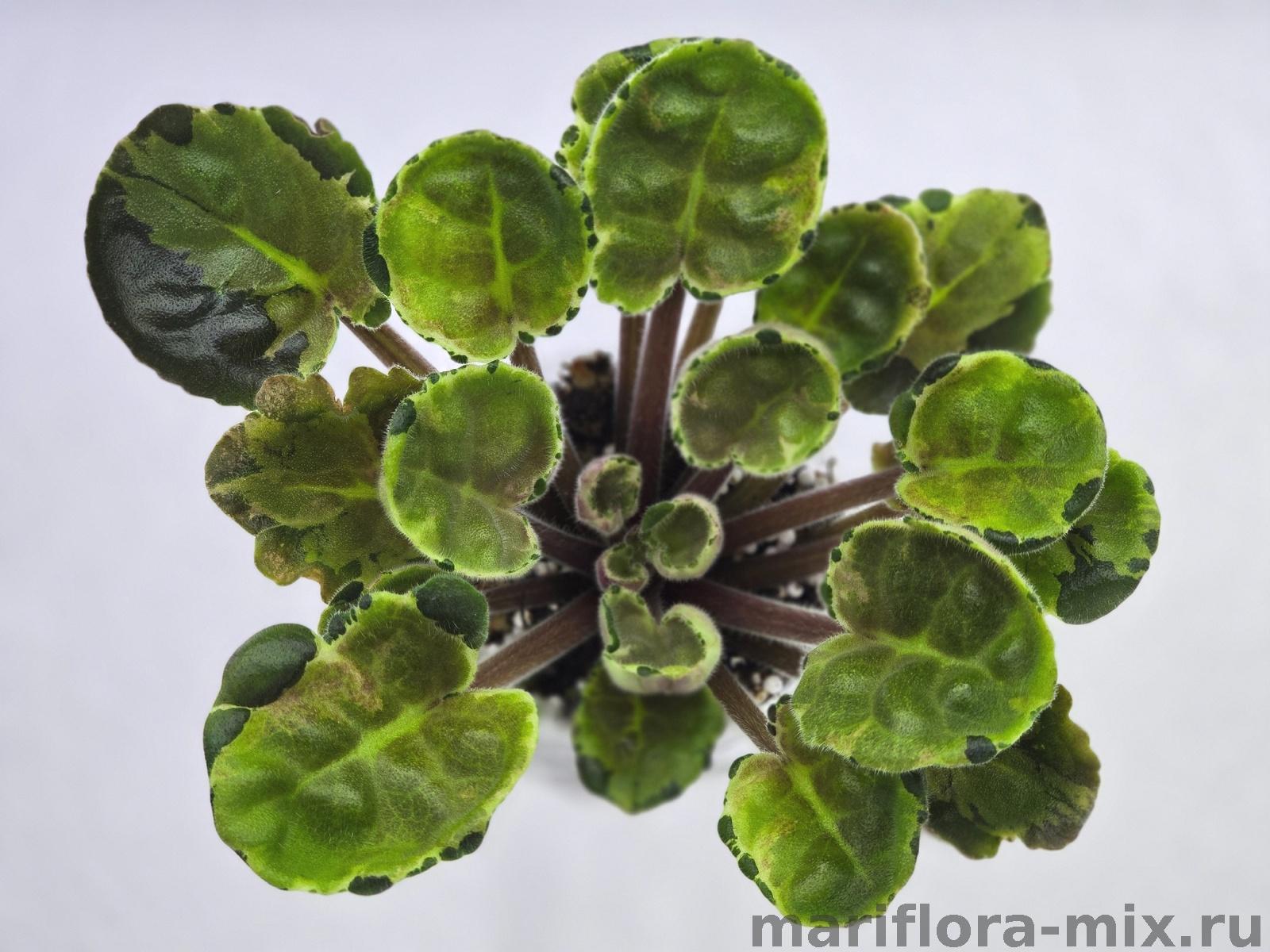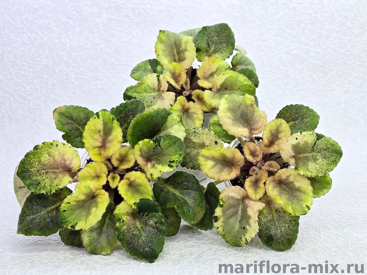 Листовая химера. Листья с широким белым краем и серо-зеленым центром. Изнанка листа малиновая и это слегка окрашивает белый цвет в розовый. В основании листовой пластины, и по белому полю, хаотично-разбросанные темно-зеленые (почти черные) пятнышки. Химера устойчива, с хорошей передачей сортовых признаков. Цветки пастельно-розовые с зеленым краем. Цветет только при хорошем освещении. Мини