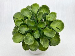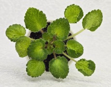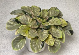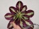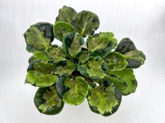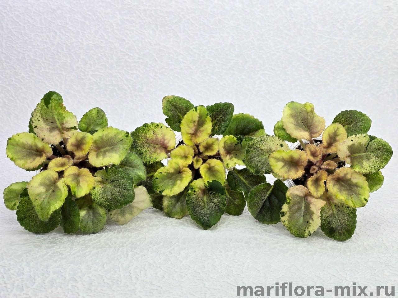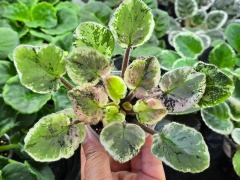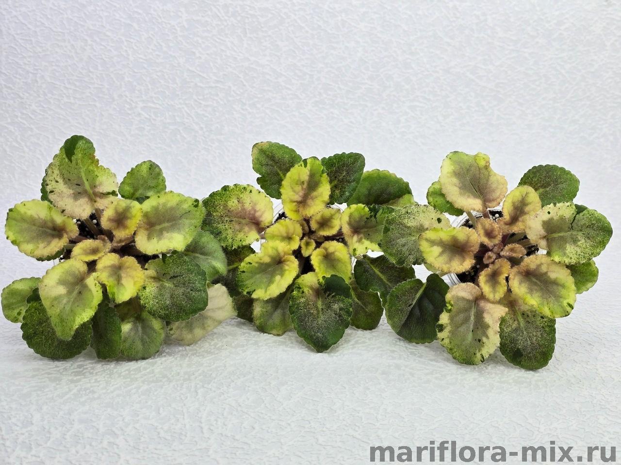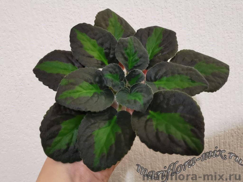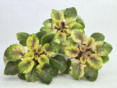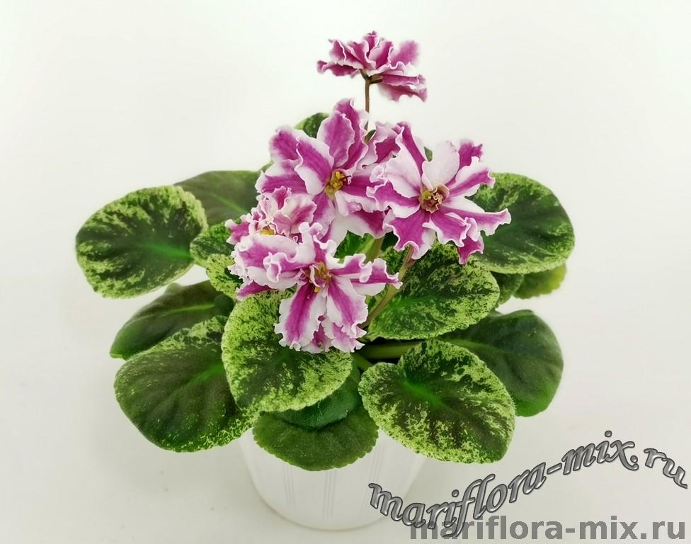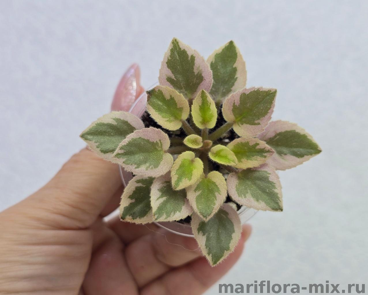 Листовая химера. Листья с широким белым краем и серо-зеленым центром. Изнанка листа малиновая и это слегка окрашивает белый цвет в розовый. В основании листовой пластины, и по белому полю, хаотично-разбросанные темно-зеленые (почти черные) пятнышки. Химера устойчива, с хорошей передачей сортовых признаков. Цветки пастельно-розовые с зеленым краем. Цветет только при хорошем освещении. Мини