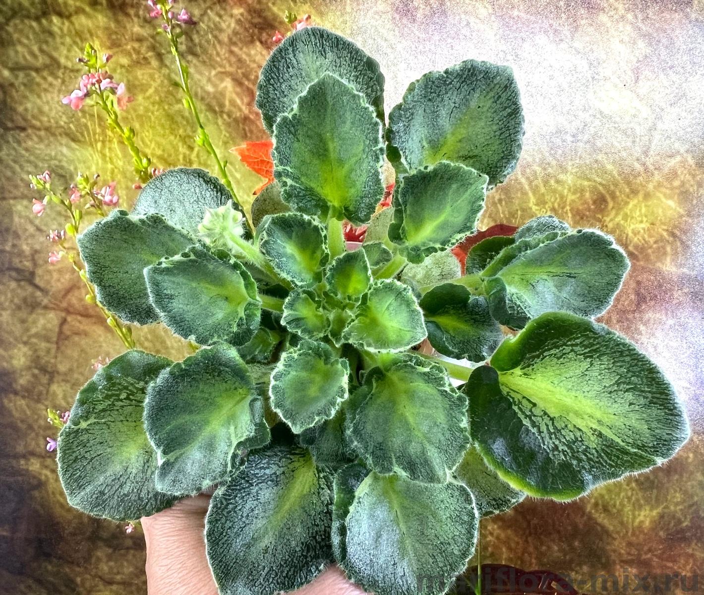 Листовая химера. Шебби Шик (Shabby chic) - «потёртый шик».. Иначе и не скажешь; невероятная листва светлых оттенков, плотной текстуры, элегантная и воздушная. При всей своей необычности и неординарности - это все же фиалка, и как любая фиалка - она цветет! Полумахровые красные цветочки периодически украшают эту милую розетку. Стандарт