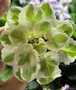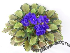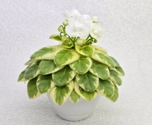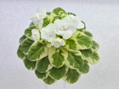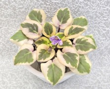 Semidouble white pansy/dark blue eye, variable thin blue edge.Variegated light-medium green and white, pointed, glossy. Sucker propagation only. Miniature.