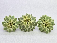 Ровная, плотная, многоярусная, пестролистная розетка, прямой заостренный бой лист. Красноватые черенки, светло-зеленое основание листа, палево-розовая и песочная окантовка. Пудрово-розовые осы. Редкий букет, продолжительное цветение. Миниатюра. 2023 год.
