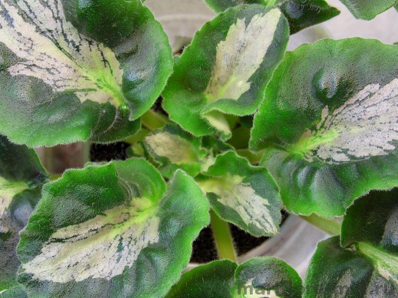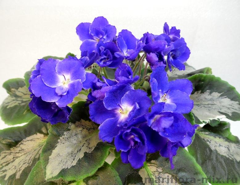 Полумахровые синие цветы с вариабельным белым глазком. Пёстрая средне-, светлозелёная и кремовая листва. Листовая химера.