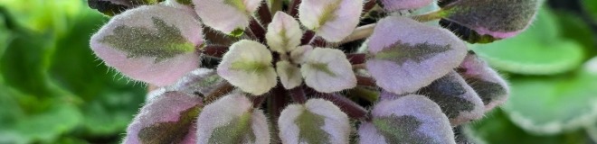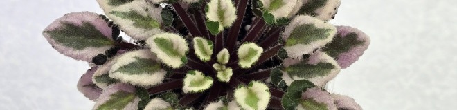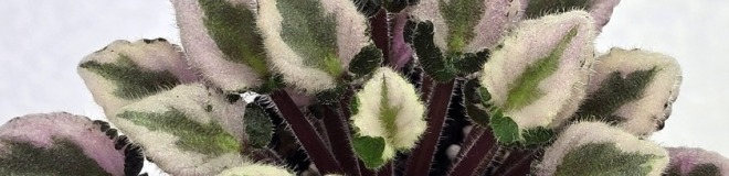 Листовая химера. Листья с широким белым краем и серо-зеленым центром. Изнанка листа малиновая и это слегка окрашивает белый цвет в розовый. В основании листовой пластины, и по белому полю, хаотично-разбросанные темно-зеленые (почти черные) пятнышки. Химера устойчива, с хорошей передачей сортовых признаков. Цветки пастельно-розовые с зеленым краем. Цветет только при хорошем освещении. Мини