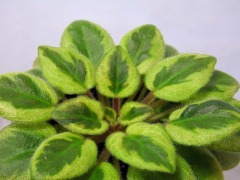 Bouquet of lots of deep orchid-mauve sdbl. pansies atop very rare, euonymous-like green and gold variegation impervious to heat or age. Miniature chimera. AVSA #9293