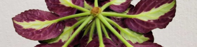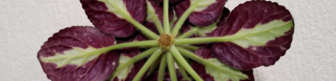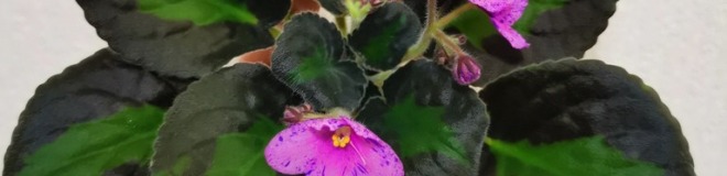 Листовая химера. Листья темно-зеленые украшены по середине пятном цвета хаки. Формирует ровную розетку. Цветы лавандово-розовые с редким синим фентази. Стандарт