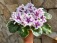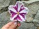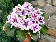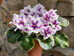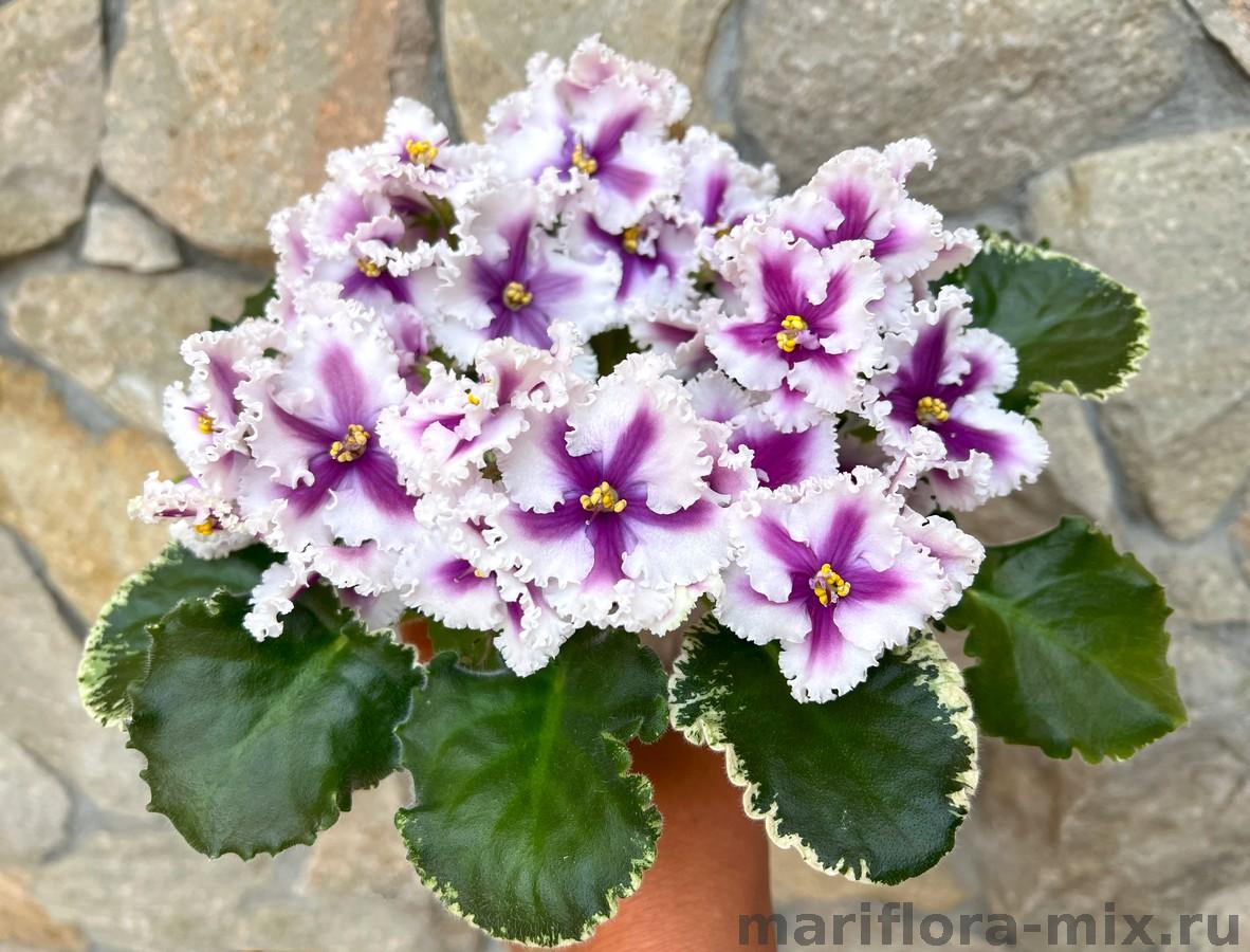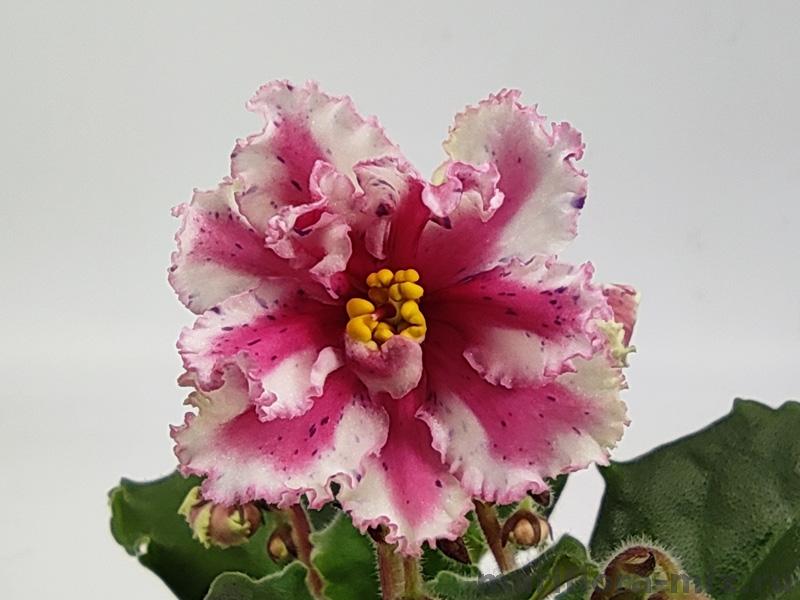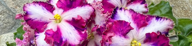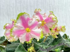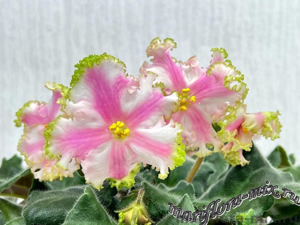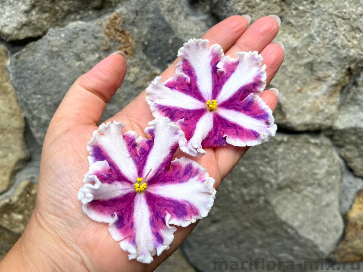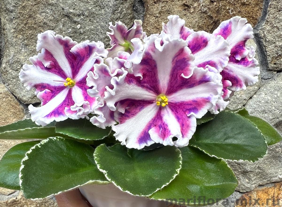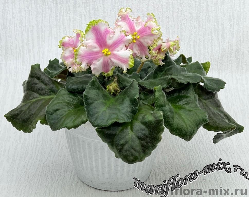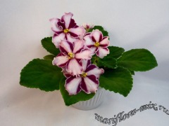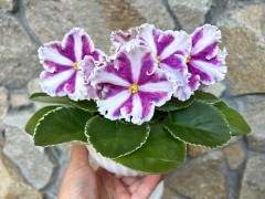 Полумахровые ярко-красные анютки с осветленной полосой по центру лепестка и зеленой рюшей, которая сильнее проявляется на ушках двух верхних лепестков. Темно-зеленая волнистая листва. Малый стандарт