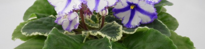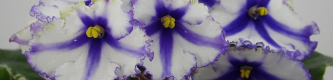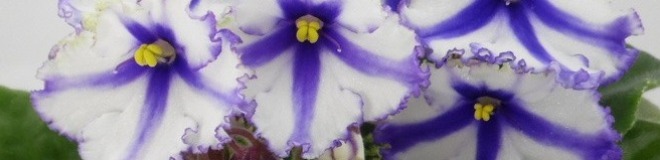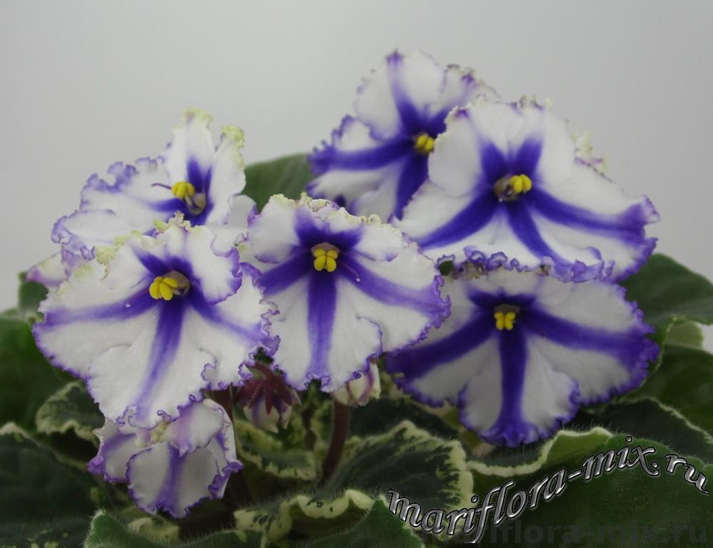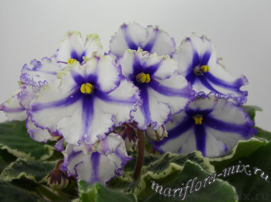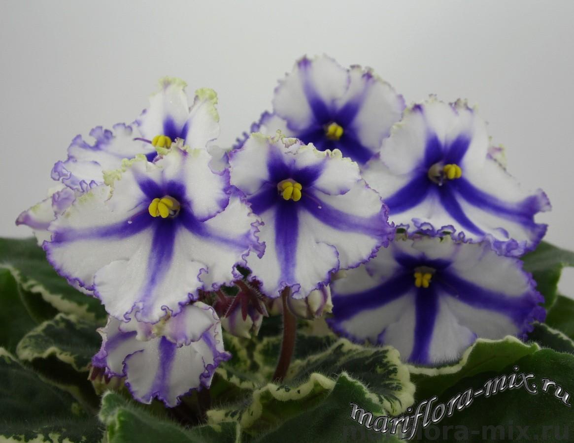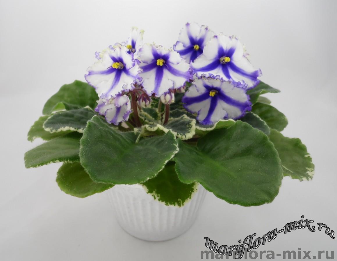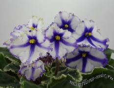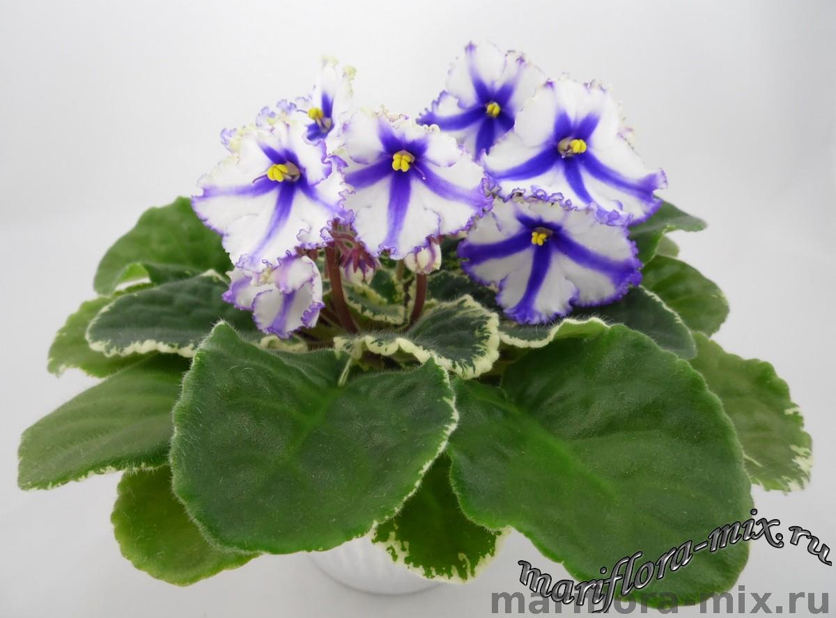 Крупные белые анютины глазки с синими полосами, синим глазком и синей окантовкой. Аккуратная пестролистная розетка. Постоянное и обильное цветение. Спорт от сорта Lonestar Twilight