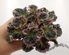 Простые или полумахровые крупные лавандовые цветы с широкой белой каймой и сеточкой на двух верхних лепестках. На нижних лепестках - менее явно выраженный венозный рисунок и тонкая белая кайма. Гофрированная гёл-листва с бело-розовой окаймляющей пестролистностью. Компактная розетка. Полуминиатюра