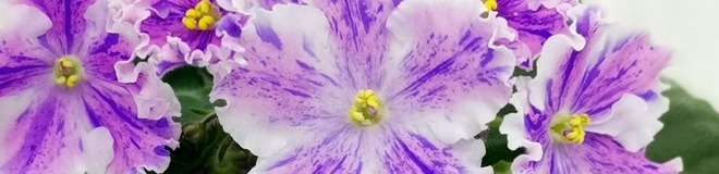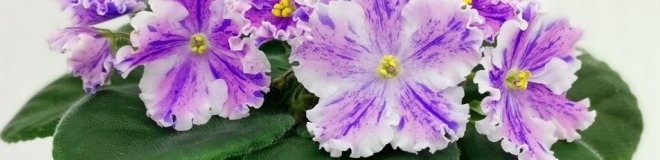 Крупная нежно-лавандовая звезда с крупным синим фэнтези и белой широкой бахромкой. Простая зеленая листва.
