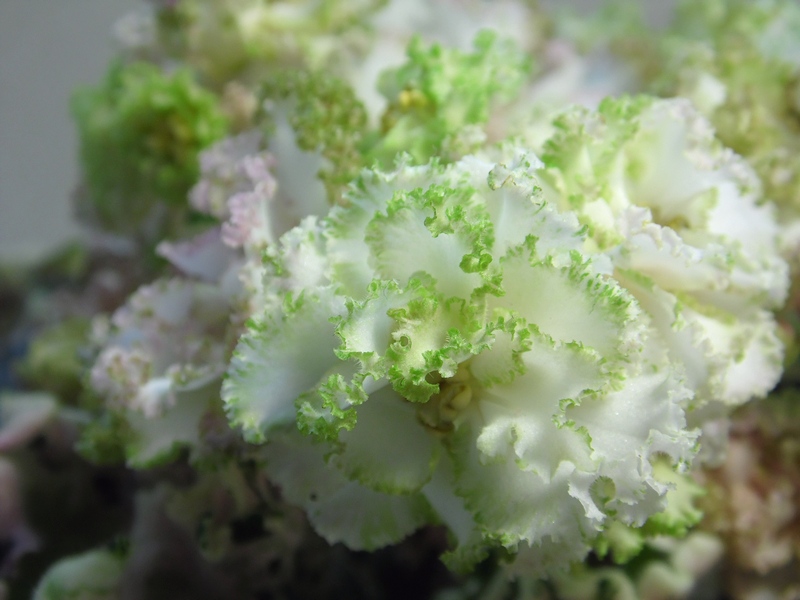 Махровые,сливочно-белые с очень мелкими зеленоватыми зубчиками по краю лепестков цветы.Цветение шапочкой. Слегка волнистые зеленые стеганые листья с с белой пестролистностью. Стандарт.