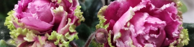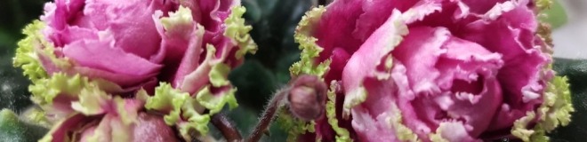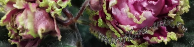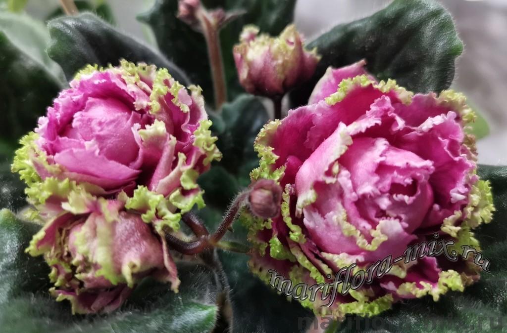 Очень крупные густо-махровые розы-кочанчики неописуемого цвета, малиново-дымчато-розовые с бело-зелёной бахромой. Тёмно-зелёные листья. Цветки, как прекрасные розы, тронутые инеем после первых заморозков. Настоящие розы!