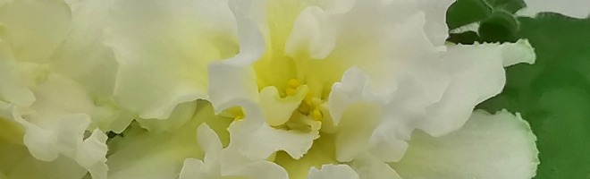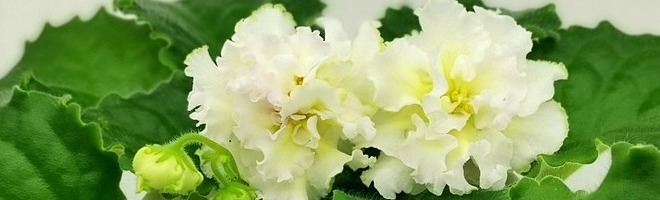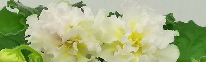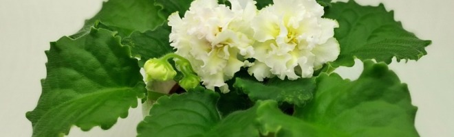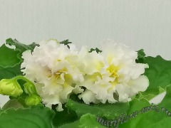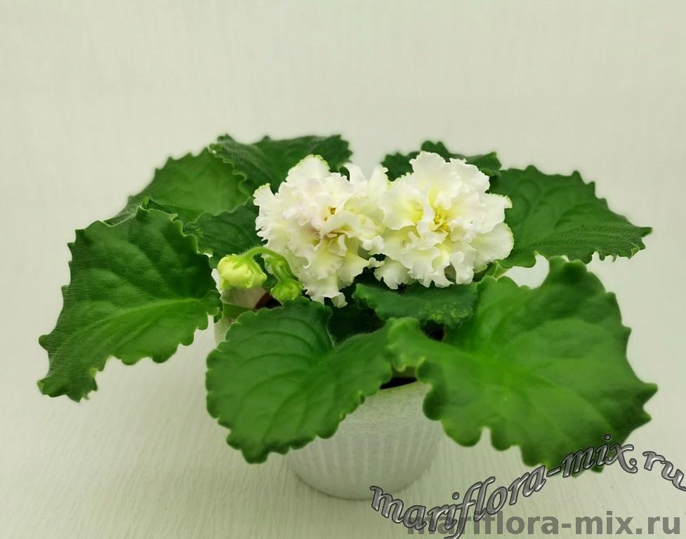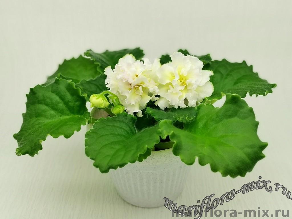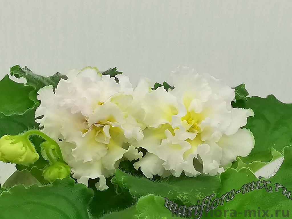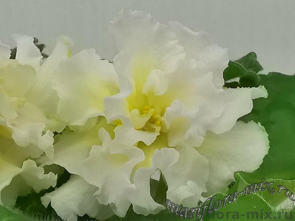 Очень крупные махровые объёмно-фактурные бело-розоватые цветы, середина цветка сливочно-лимонного цвета. Выставочная зелёная розетка из волнисто-фестончатых листьев. Пышное букетное цветение. Этот сорт напоминает собой торт, богато украшенный сливочно-кремовыми розами.
