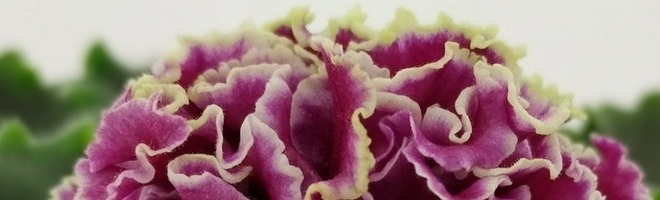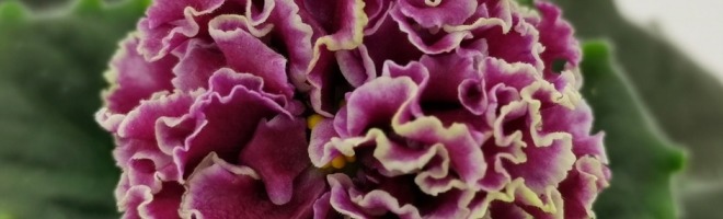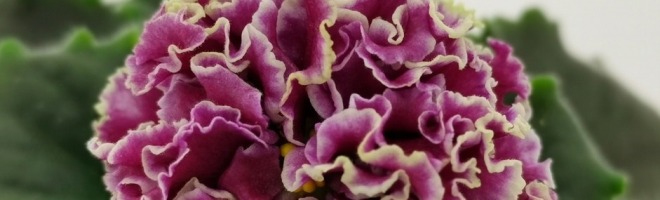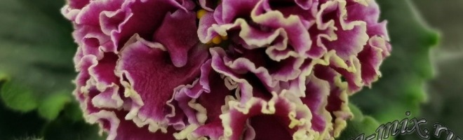 Густо-махровые цветы помпоны темно-вишневого цвета с белой окантовкой. Обильное цветение над средне-зеленой слегка зубчатой листвой.