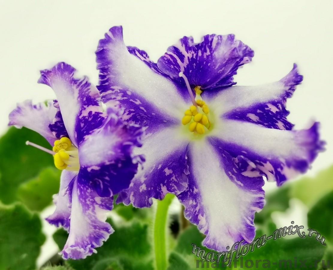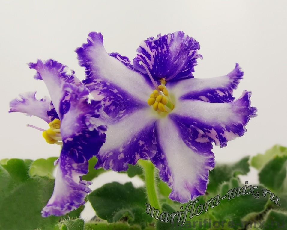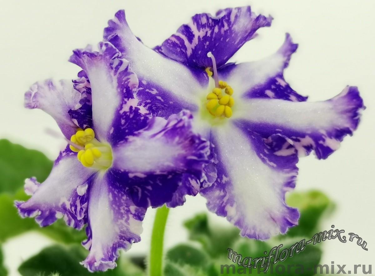 Химерный спорт от НД-Кристалл Сваровски. Огромные синие испещренные белым фентези звезды с былыми полосами идущими из центра к краям гофрированным лепесткам. Листва светлая волнистая.