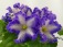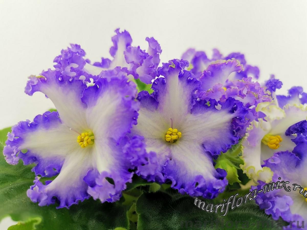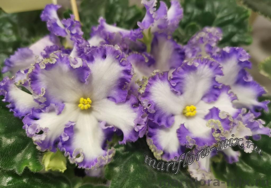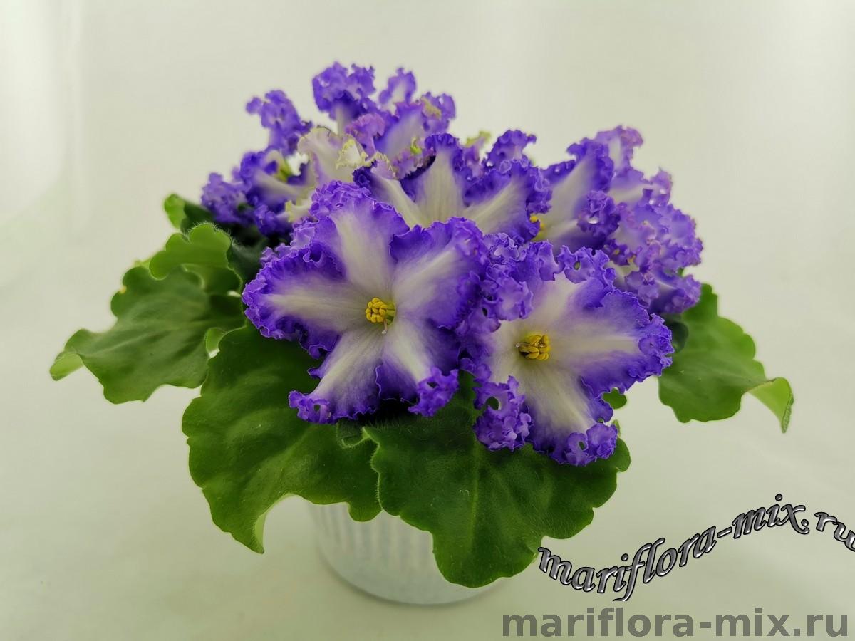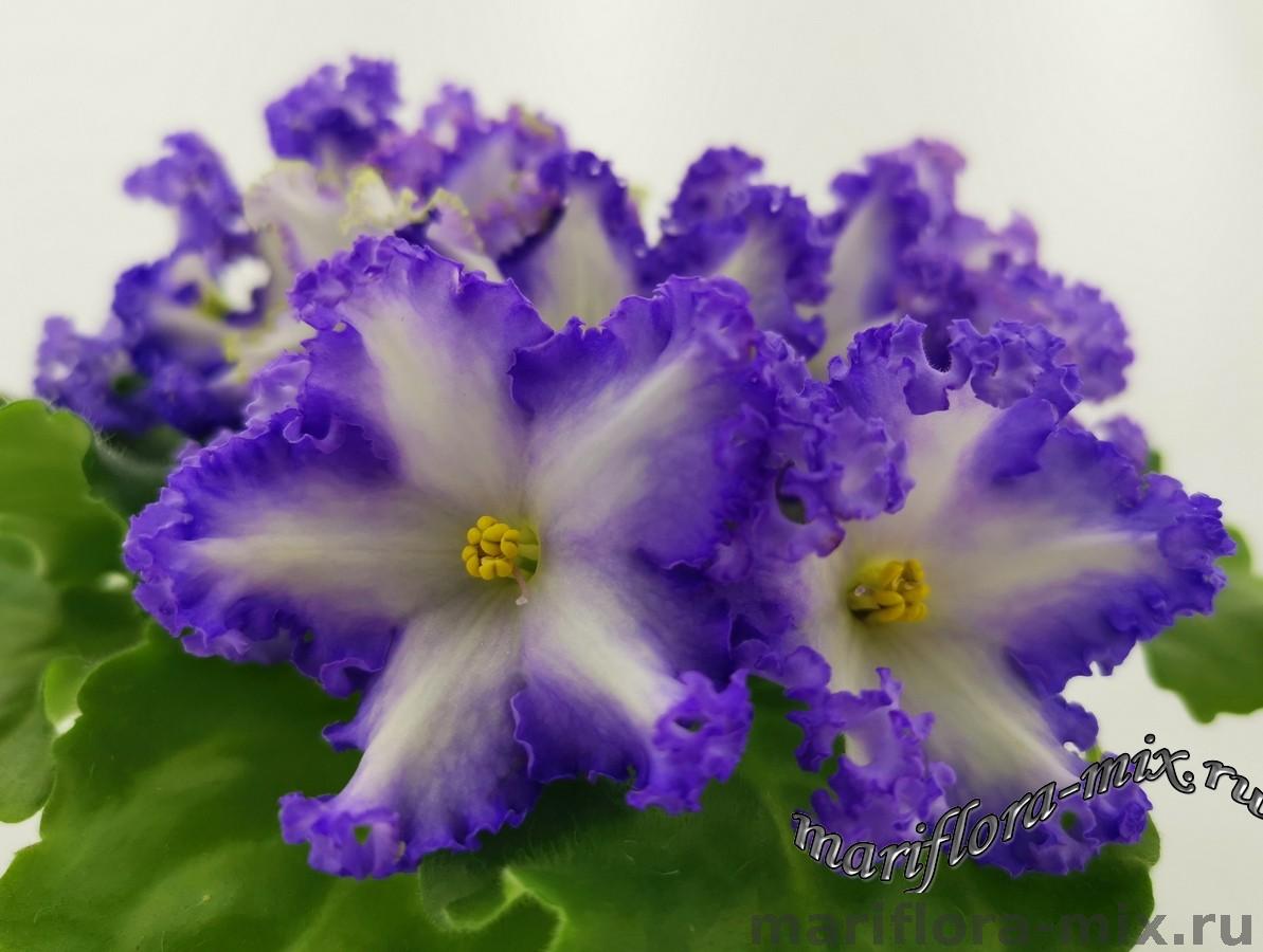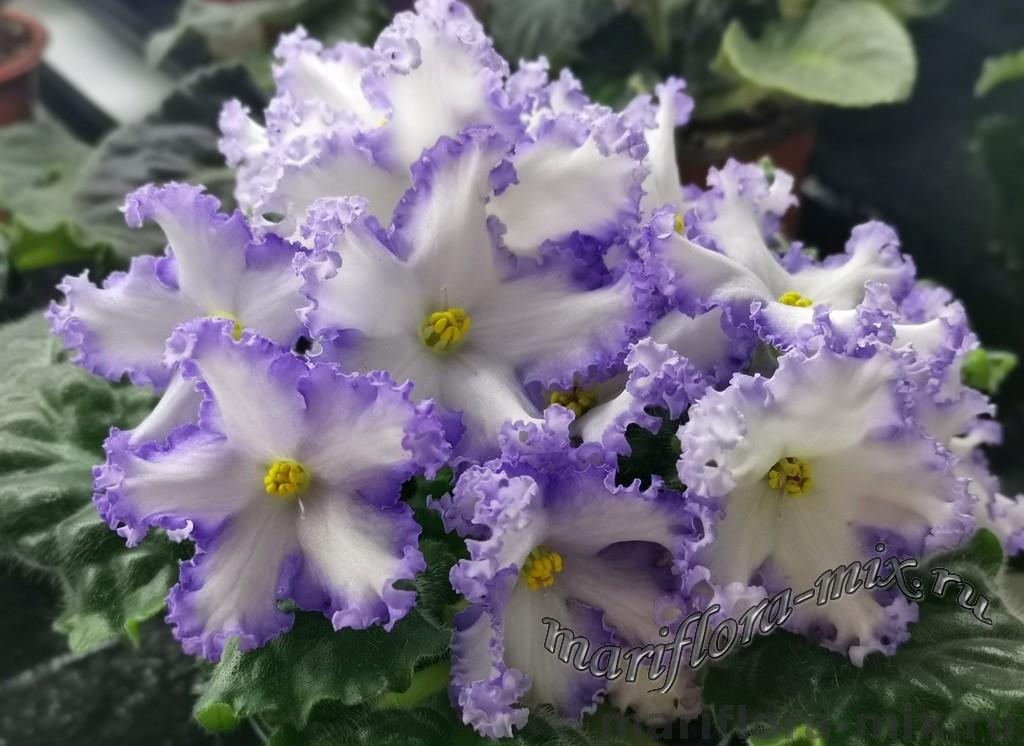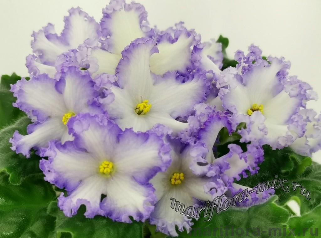 Эффектный контрастный сорт! Крупные простые белые звезды с гофрированной сине-голубой каймой. Кайма не заплывает. Цветение обильнейшее, огромной, пышной "шапкой", продолжительное. Стандартная розетка, зеленые слегка волнистые листья. Сорт нужно выращивать с листа и доводить до цветения несколько деток, т.к. цветы не у всех деток может быть гофрированным и контрастным.