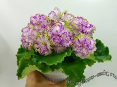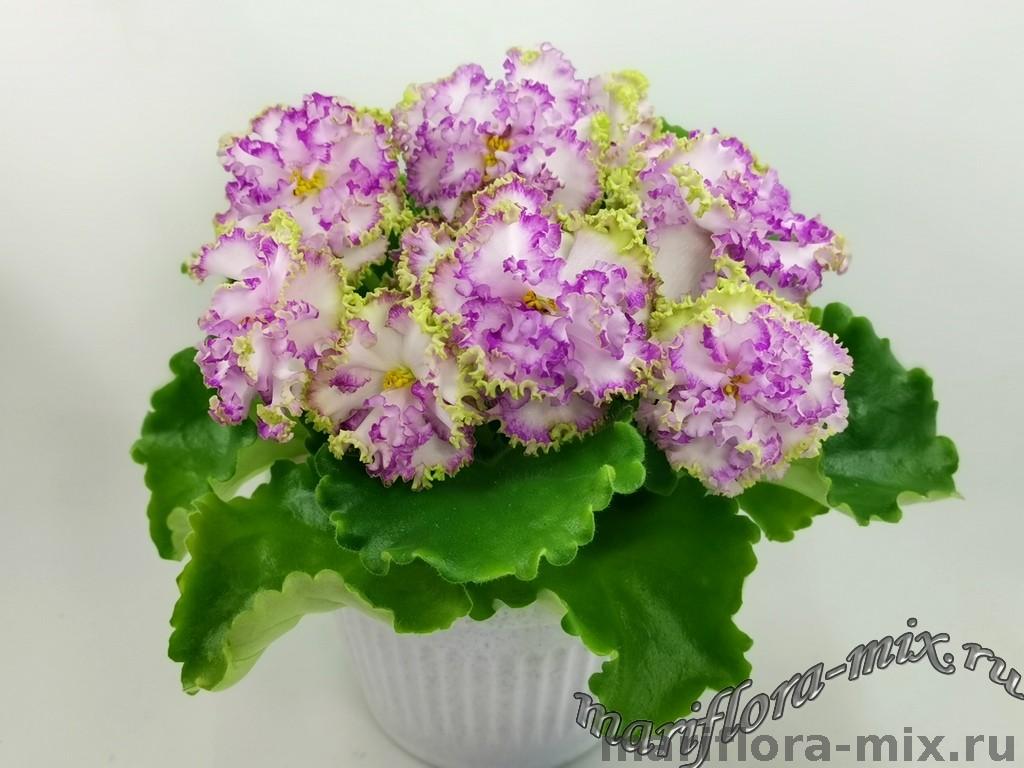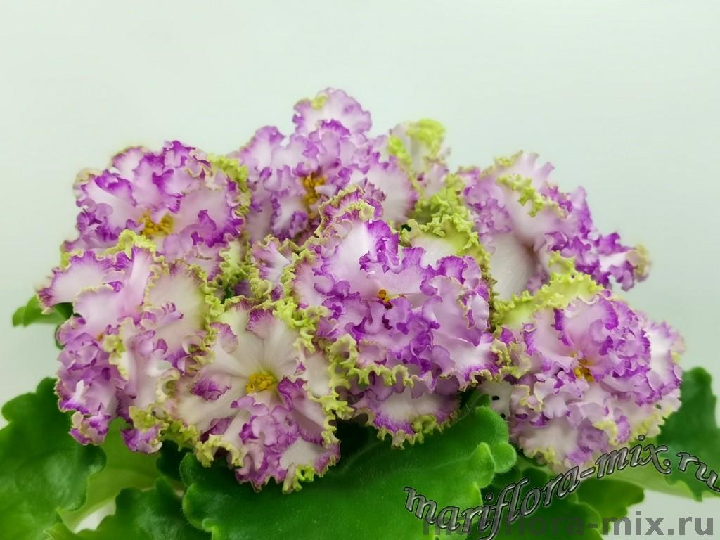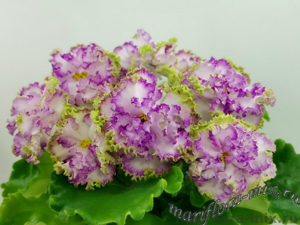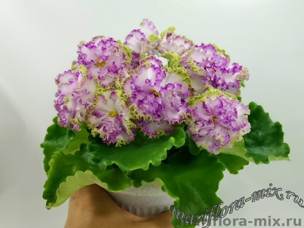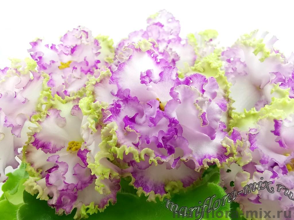 Цветок: Крупные простые и полумахровые белые звезды с розово-салатовым гофрированным рюшем.