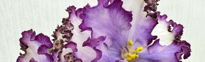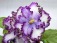 Цветок: Очень крупные простые и полумахровые белые гофрированные звезды с темно-красной гофрированной каймой и фиолетовыми лучиками из центра.