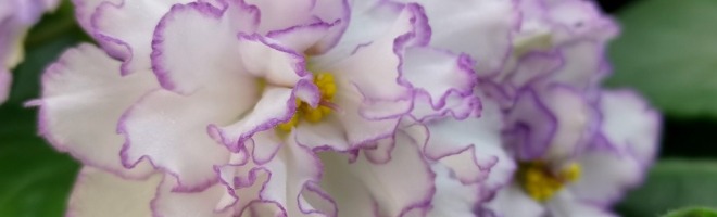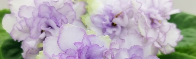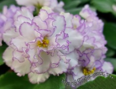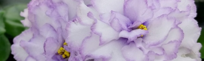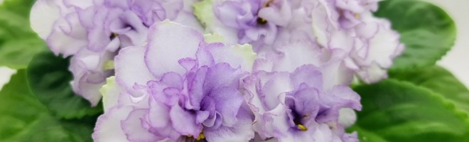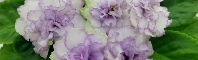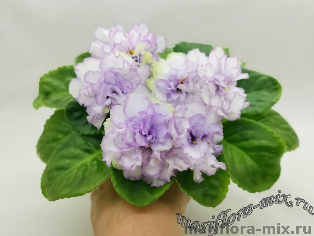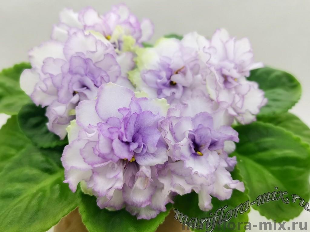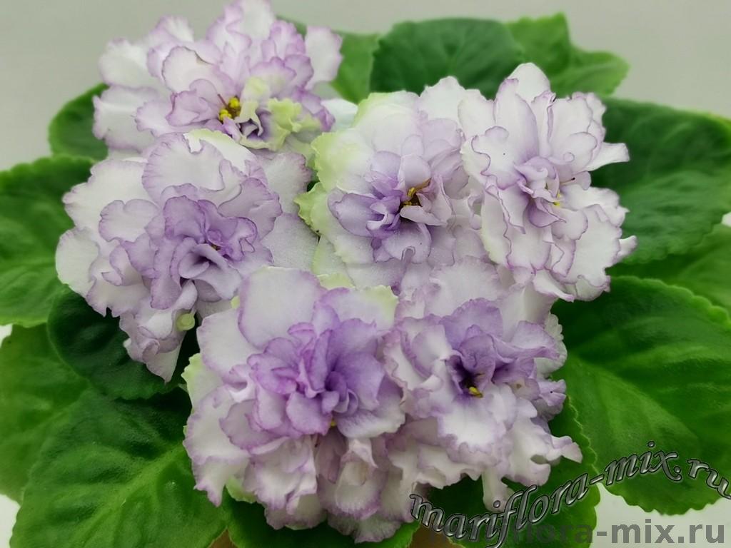 Цветок: Очень крупные махровые белые волнистые звезды с сиреневым краем