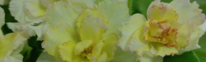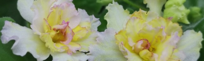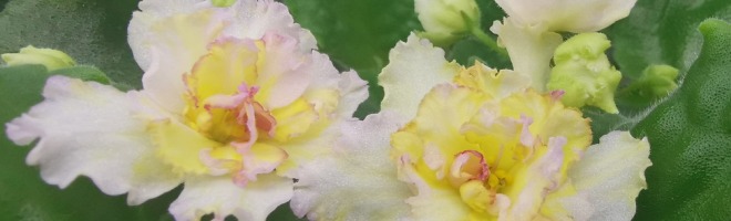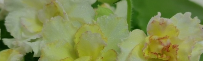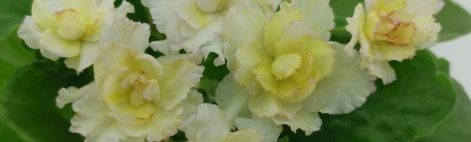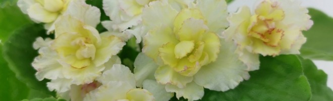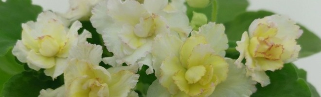 Цветок: Гроздья некрупных гофрированных махровых белых розочек с желтым центром и прерывистой розовой каймой.