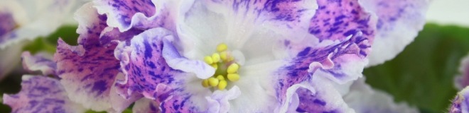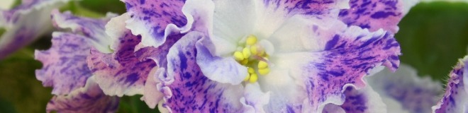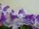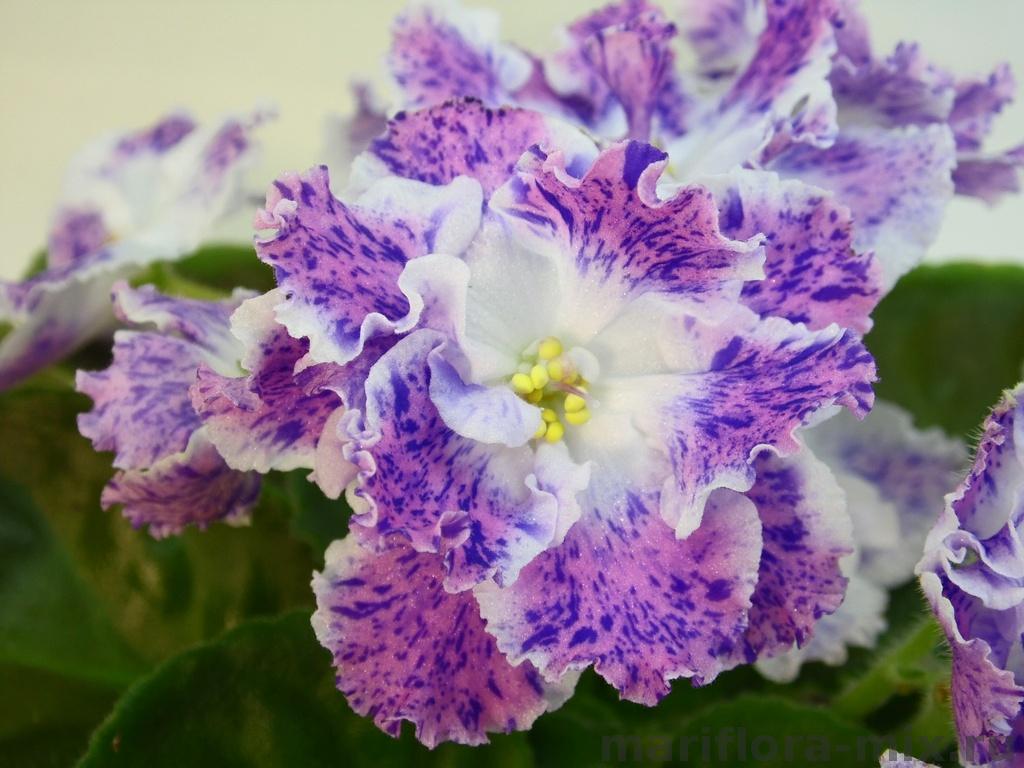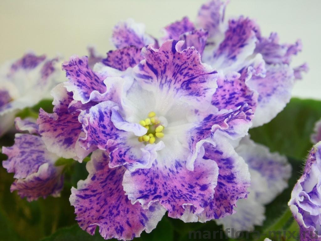 Крупные простые и полумахровые белые цветы с ярко розовыми напечатками и синим фентази по ним. Хорошин цветоносы, цветение шапкой. Аккуратная розетка из средне зелёных листьев.