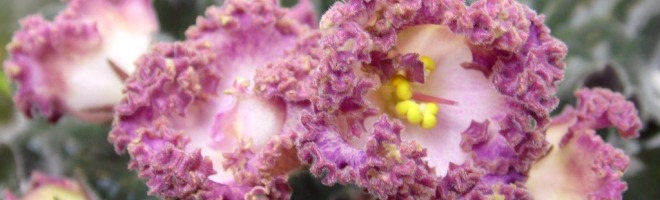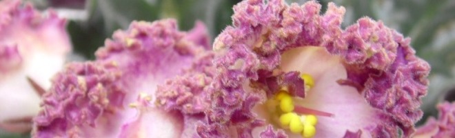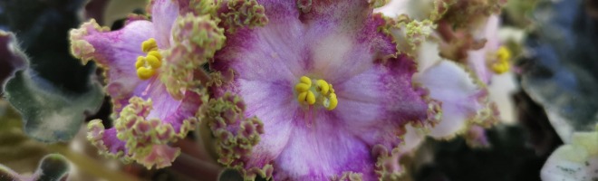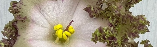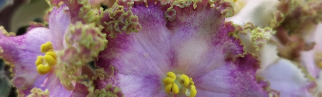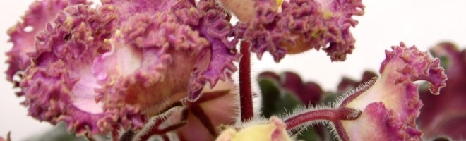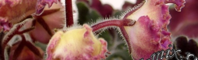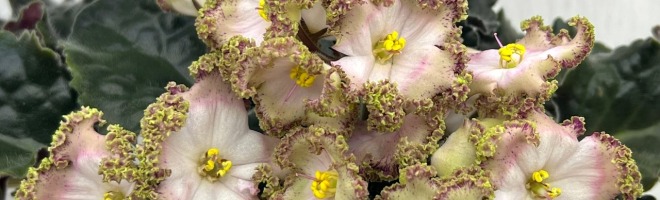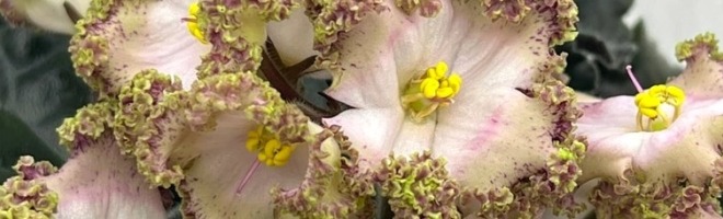 Кремово-белые чашевидные цветы с тонкой малиновой каймой напылением и золотисто-бронзовой сильно гофрированной широкой бахромой. Расцветают цветы колокольчатой формы, рюш по мере роста цветка становится более выраженным. Листва темно-зеленая