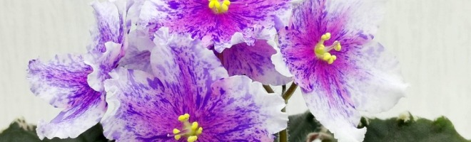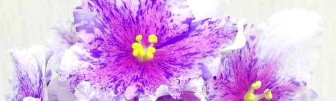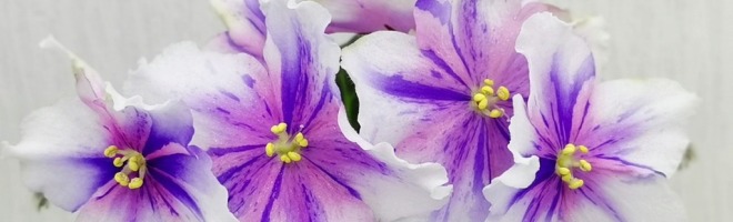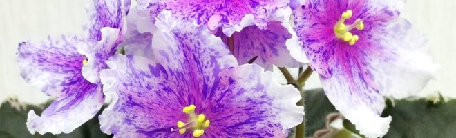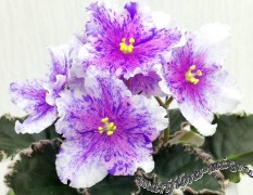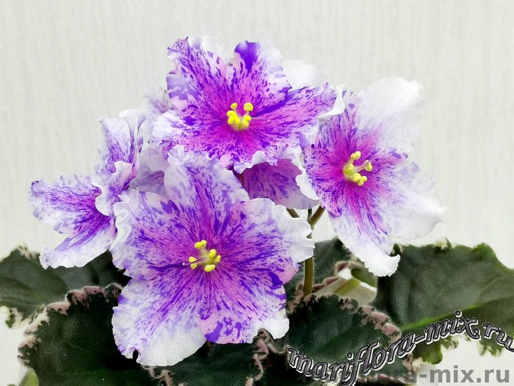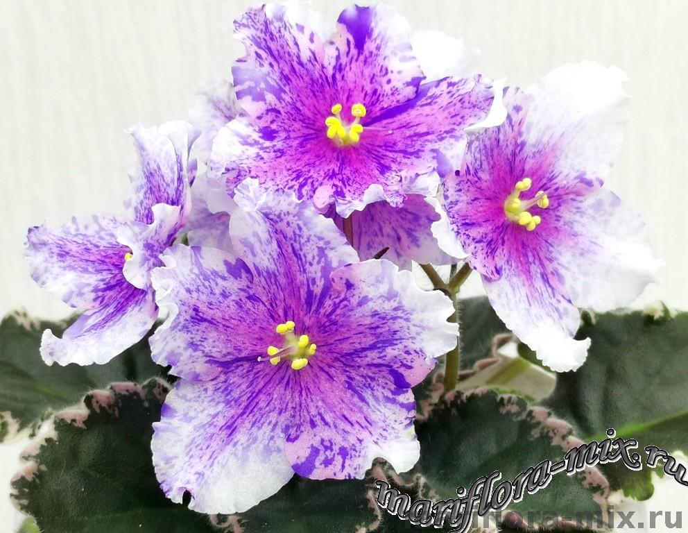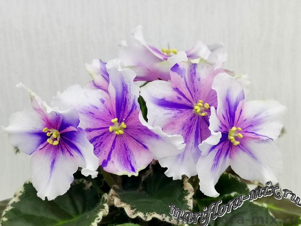 Крупные белые простые звезды с ярким малиновым глазком и синим фентези. Красиый пестролистник, компактная розетка, темные листья. 2021