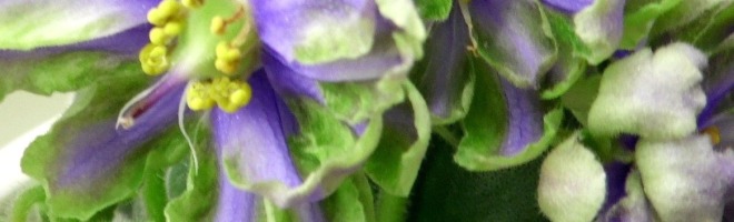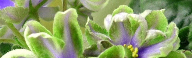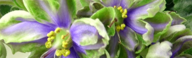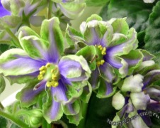 Крупные белые полумахровые или махровые звезды с широкой зеленой каймой и голубым глазком. Ровная светлая пестролистная розетка.