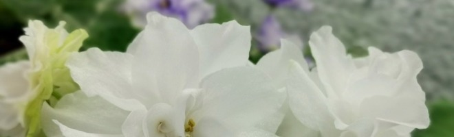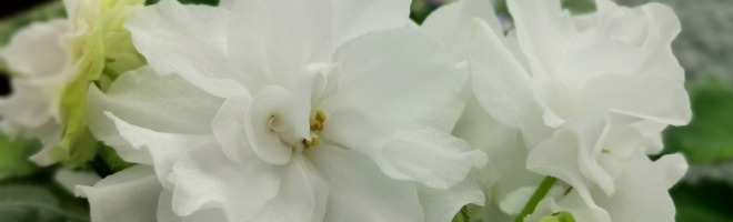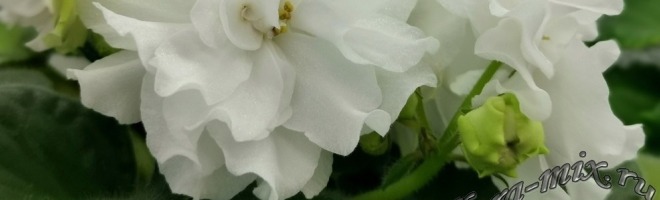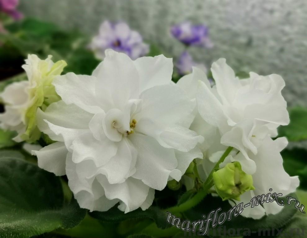 Огромные белоснежные махровые звёзды,обильное цветение над средне-зелёной ровной розеткой.