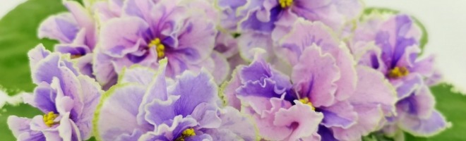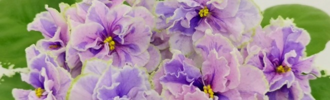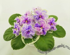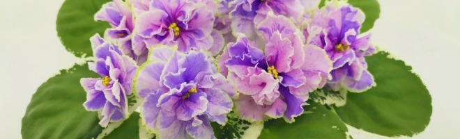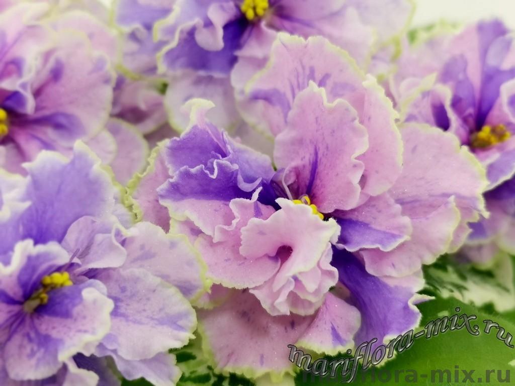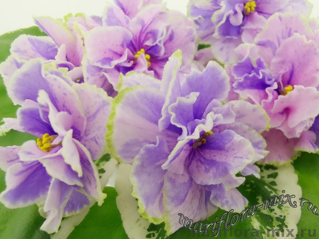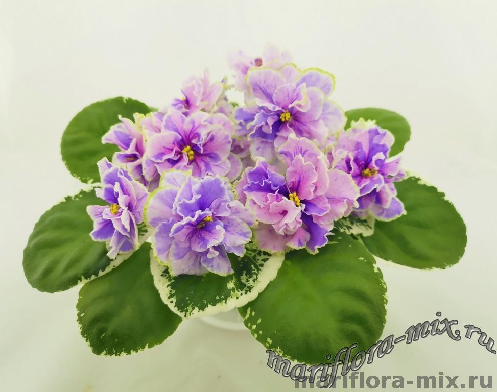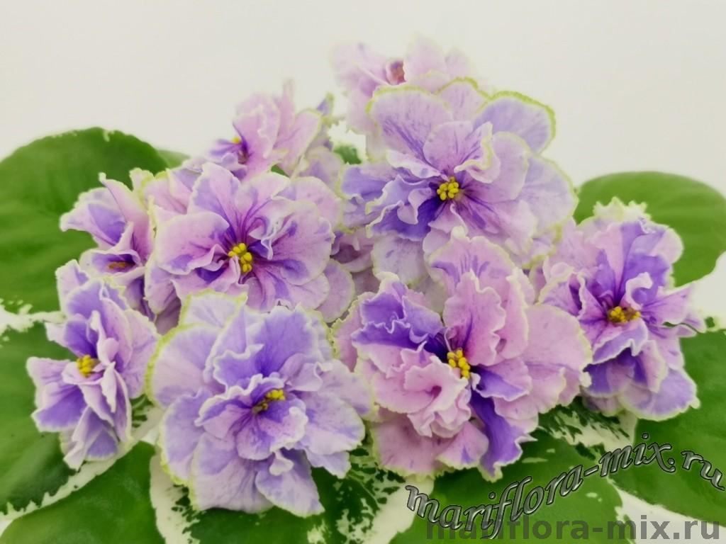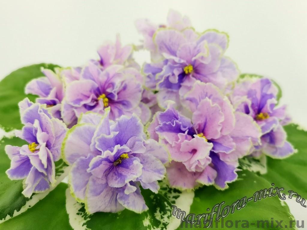 Крупные белые полумахровые цветы с сине-сиреневым фентази и розовой пропиткой в центре цветка. Пестролистная розетка.Новинка 2020 г