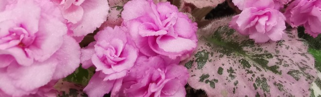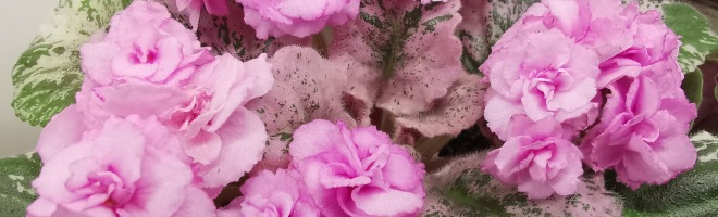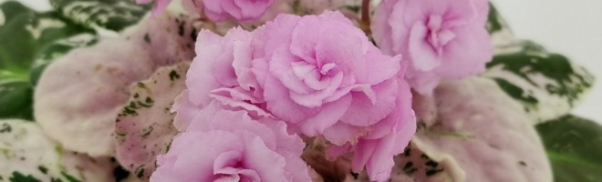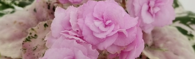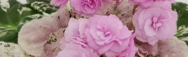 Махровые розовые оборчатые звезды с темным глазком. Мозаичная пестролистность на средне-зеленой, розовой с белым, ровной, стеганой листве. Стандарт.